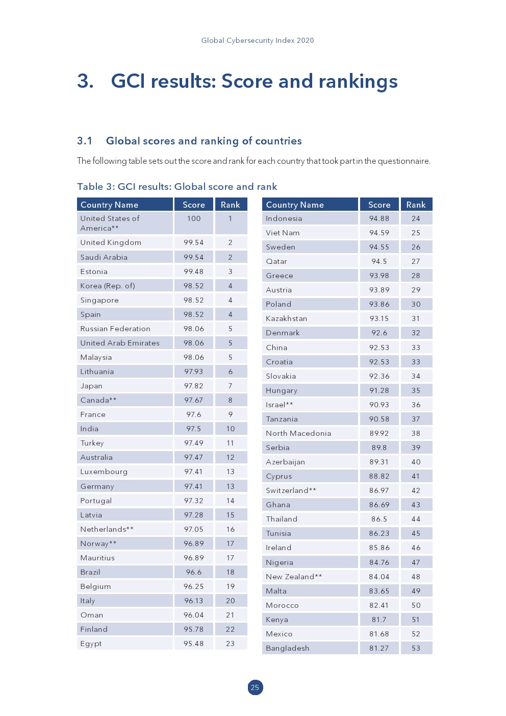 通过正式建立的论坛进行讨论,以实现自我评估和更好的协调;收集有关用于在国家层面管理网络安全的总体国家举措和资源的见解;以优秀实践、合作伙伴和区域邻国为基准;提高各利益相关方对国家层面协调需求的认识。GCI的结果表明,网络安全议程的所有五个支柱都得到了整体改进和加强,但网络能力方面的地区差距仍然存在。从全球得分和排名来看,美国排在首位,其次是英国、沙特阿拉伯和爱沙尼亚。这四个国家的得分都超过99分。其他排在前十名的国家还有韩国、新加坡、西班牙、俄罗斯、阿拉伯联合酋长国和马来西亚等。中国排在第三十三位,网络安全得分92.53。