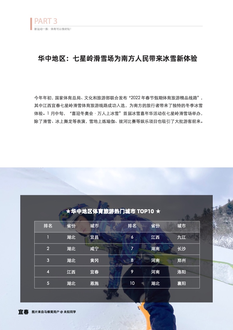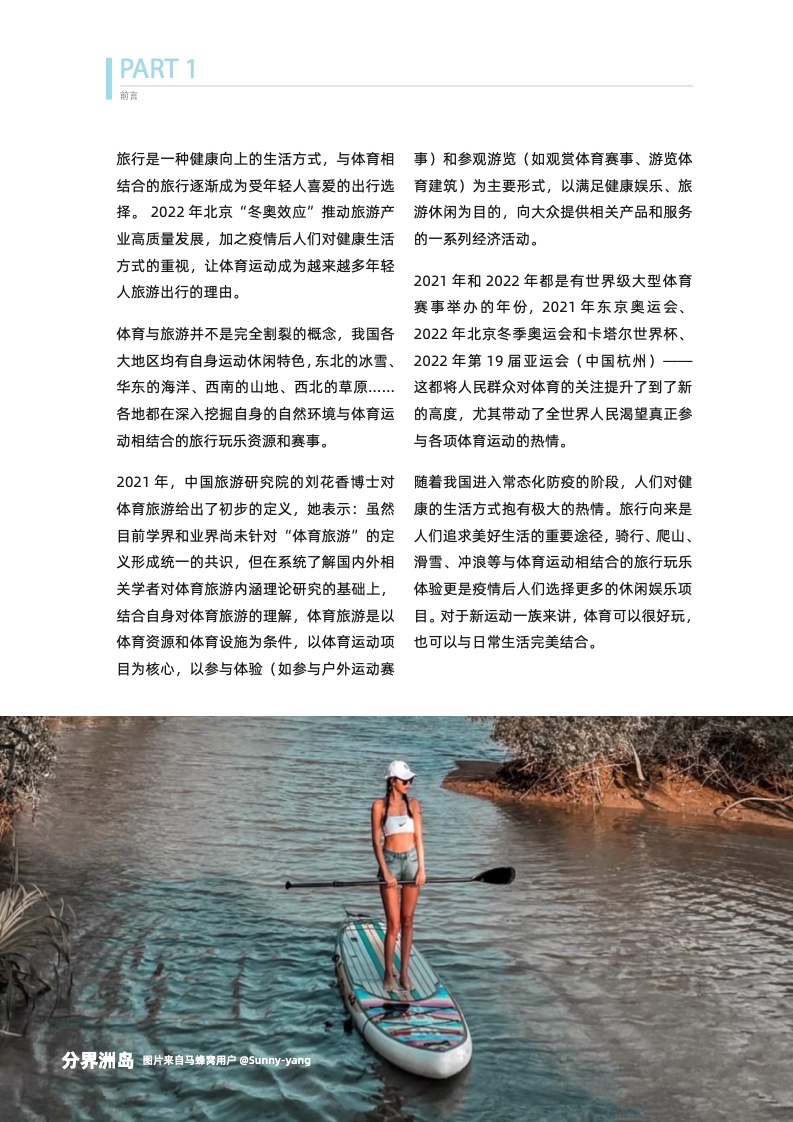 “冬奥效应”极大地推动了旅游产业的高质量发展,加之疫情后人们对健康生活方式的重视,体育运动成为越来越多年轻人旅游出行的理由。马蜂窝近期发布体育旅游主题报告《去运动,去旅行!》,报告显示,与体育相结合的旅行逐渐成为受年轻人喜爱的出行选择。