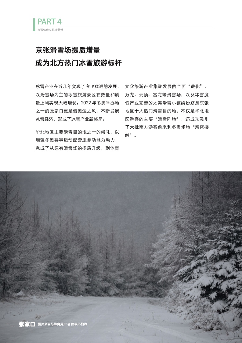 在冬奥的带动下,京张地区已经成为体育旅游的新标杆。京张两地都是文化与历史底蕴非常深厚的地区,这里包含6项世界文化遗产、136个全国重点文物保护单位、61项国家级非物质文化遗产代表性项目……京张体育文化旅游带的形成将深入挖掘北京和张家口的历史文化积淀,从更创新的角度提供可持续的、吸引更多年轻人的旅行玩乐方式。