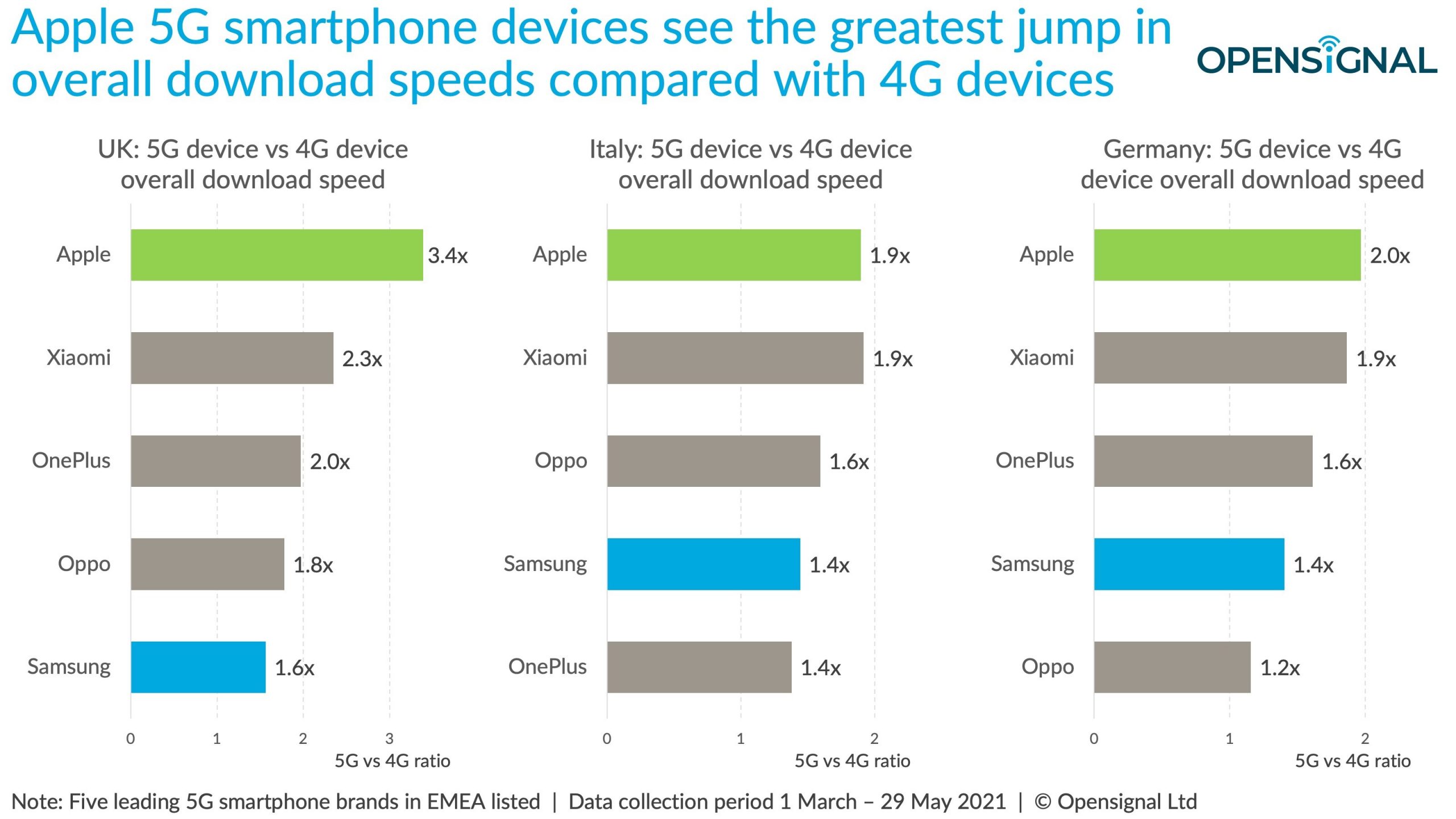 对于iPhone设备来说,在英国快3.4倍,在意大利快1.9倍。