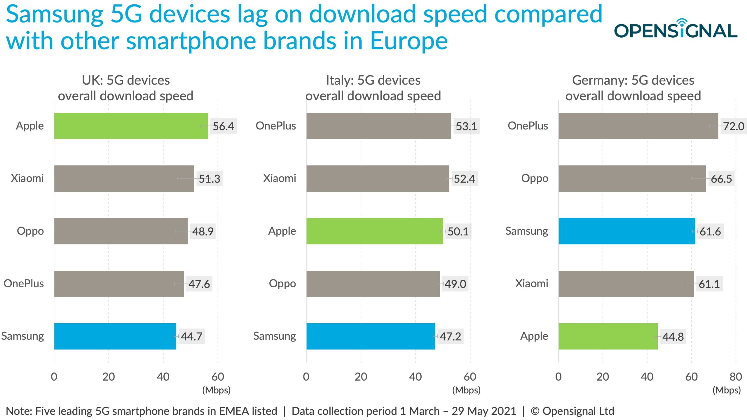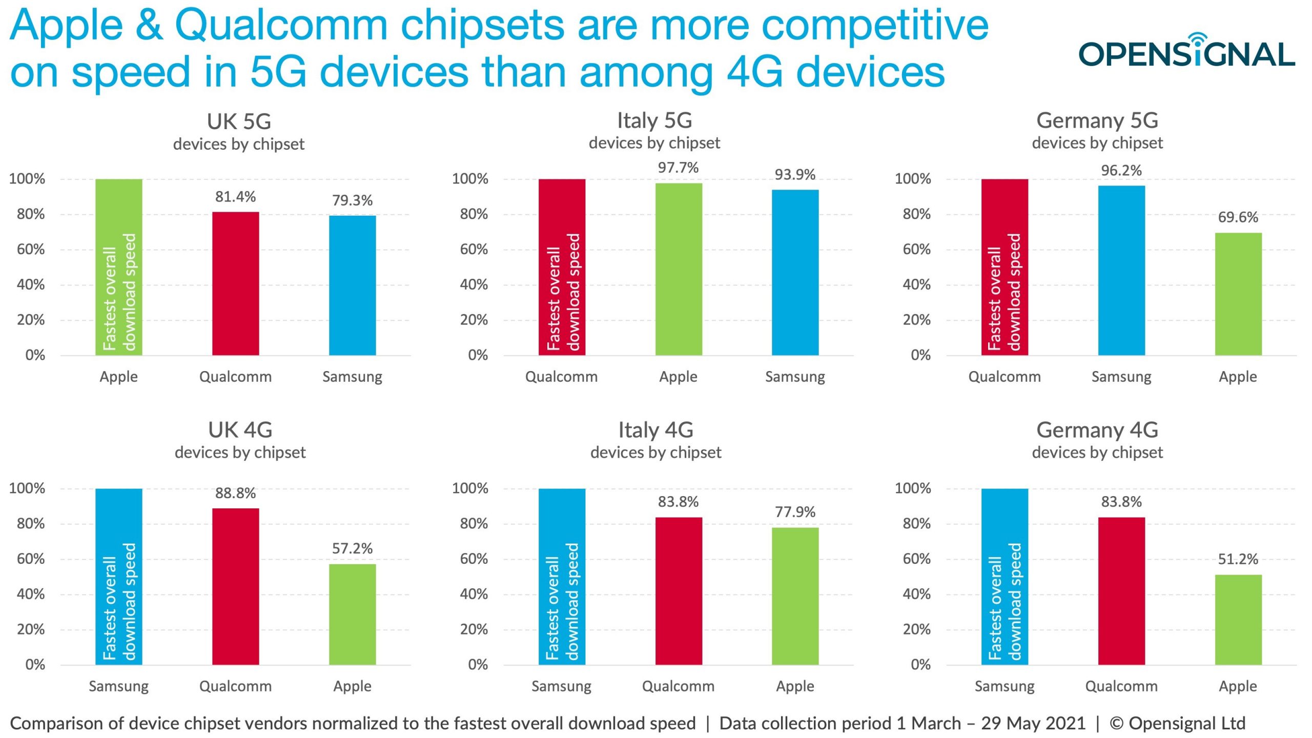 三星在欧洲使用其内部的Exynos芯片组。在美国,三星则用高通芯片组。中国品牌OPPO、OnePlus、小米和华为是更重要的参与者。移动运营商可获得新的5G频谱容量。在欧洲,大多数移动运营商都为5G设备提供了新的3.5 GHz频谱。按整体下载速度排名前 30 的 5G 智能手机型号,三星在英国和德国分别占57%和53%;但在意大利仅占23%,落后于OPPO的27%。