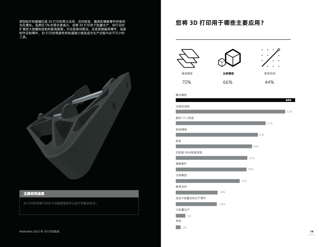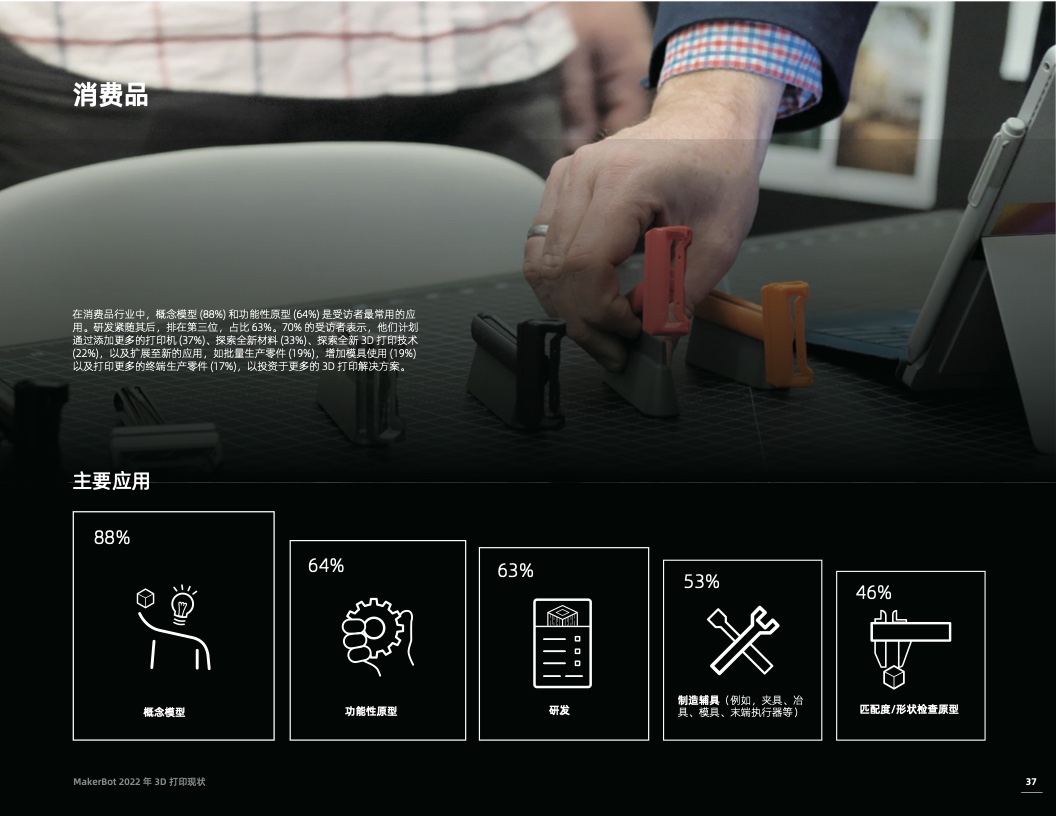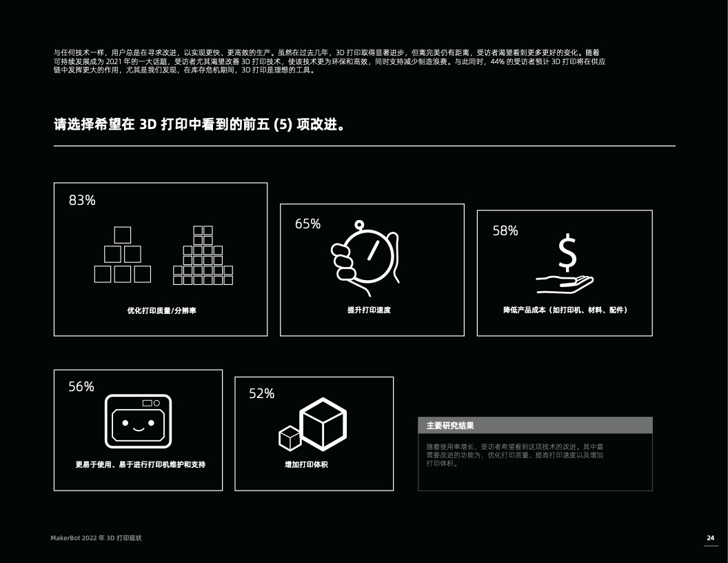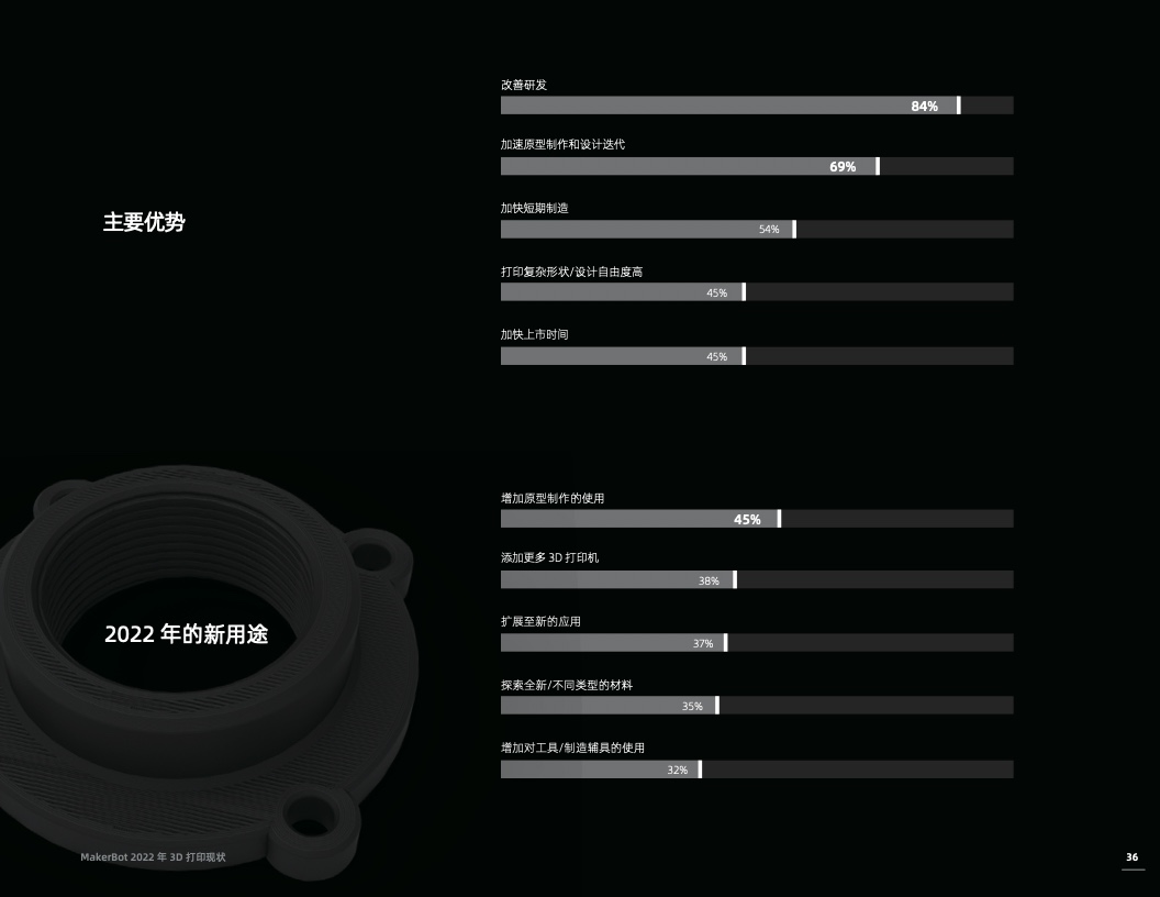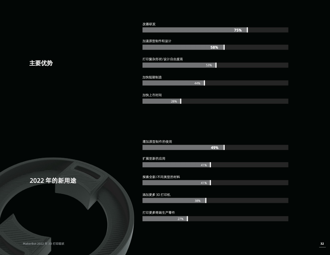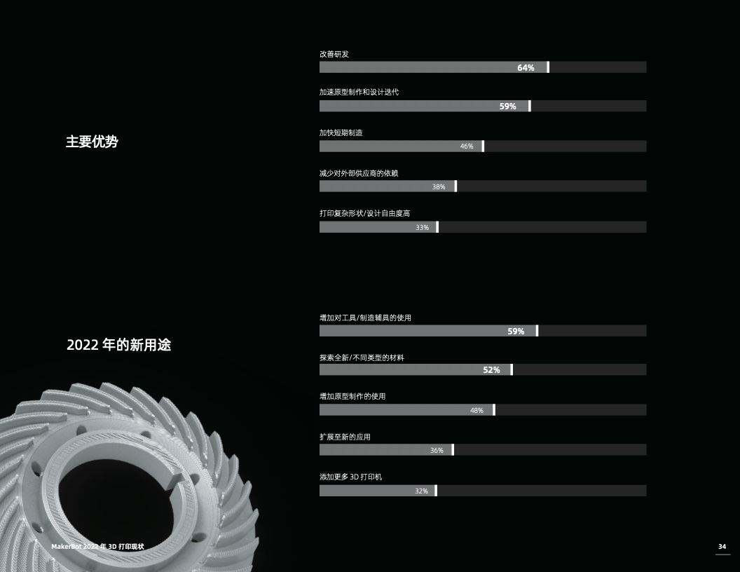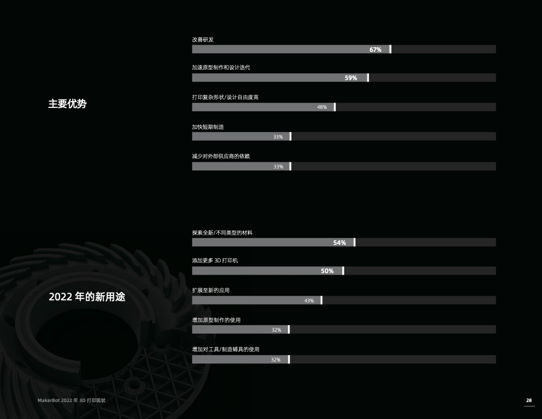 在3D打印的使用体验反馈中,除了改善设计和原型制作流程,一些受访者提到了3D打印技术改善了他们的研发项目(57%),还有部分受访者称3D打印技术降低了他们对外部供应商的依赖(35%)。首次有受访者称该投资是为促成大规模生产制造(8%)。3D打印技术正在功能原型和概念建模之外的应用领域不断扩展。医疗保健行业受访者主要将其应用于研发(78%),而消费品行业的受访者也将研发列于3D打印技术应用排名前三。受访者期待看到3D打印技术的持续发展。打印质量提升(83%)、打印速度加快(65%)、打印体积增加(52%)位居技术发展诉求的前三位。受访者也希望3D打印产业能够在未来3-5年内不断发展以应对使用者的不同需求,其中包括在供应链中扮演更重要的角色(44%)以及用于本土化生产(32%)。33%的受访者希望能够有更好的举措减少3D打印产生的废料。报告显示,对于3D打印在可持续发展方面的关注不断增加。例如,22%的受访者使用3D打印技术以减少生产过程中产生的废料,38%的受访者希望在未来3-5年内提升产业的可持续性和循环再利用水平。