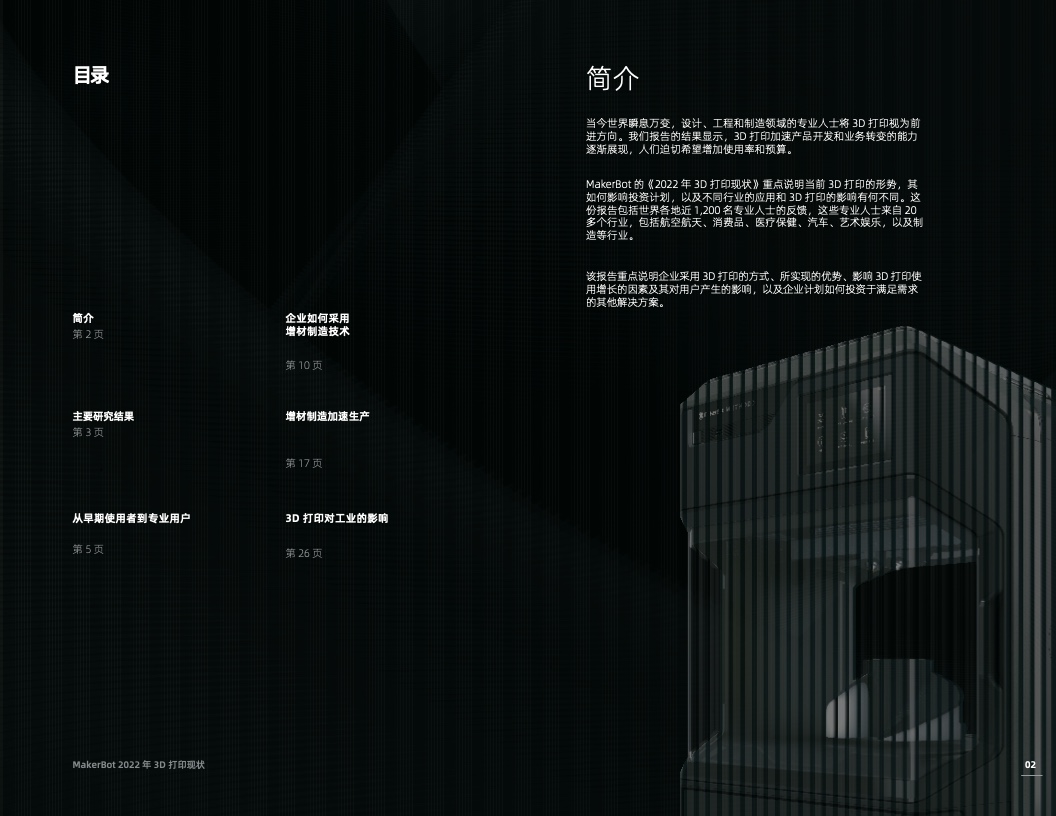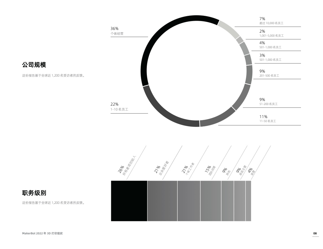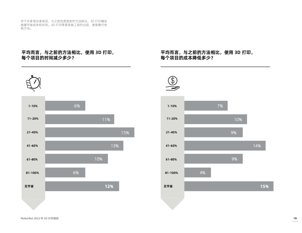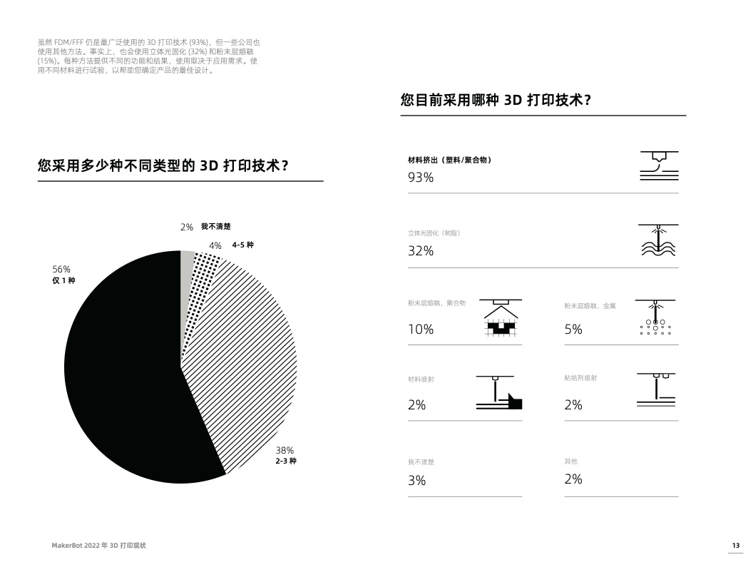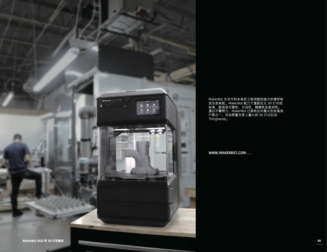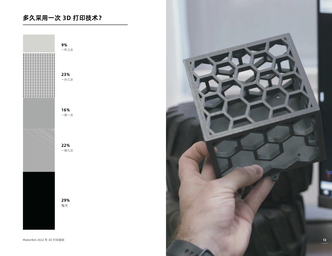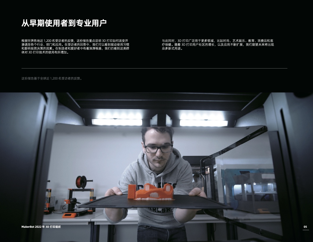 在3D打印的使用体验反馈中,除了改善设计和原型制作流程,一些受访者提到了3D打印技术改善了他们的研发项目(57%),还有部分受访者称3D打印技术降低了他们对外部供应商的依赖(35%)。首次有受访者称该投资是为促成大规模生产制造(8%)。3D打印技术正在功能原型和概念建模之外的应用领域不断扩展。医疗保健行业受访者主要将其应用于研发(78%),而消费品行业的受访者也将研发列于3D打印技术应用排名前三。受访者期待看到3D打印技术的持续发展。打印质量提升(83%)、打印速度加快(65%)、打印体积增加(52%)位居技术发展诉求的前三位。受访者也希望3D打印产业能够在未来3-5年内不断发展以应对使用者的不同需求,其中包括在供应链中扮演更重要的角色(44%)以及用于本土化生产(32%)。33%的受访者希望能够有更好的举措减少3D打印产生的废料。报告显示,对于3D打印在可持续发展方面的关注不断增加。例如,22%的受访者使用3D打印技术以减少生产过程中产生的废料,38%的受访者希望在未来3-5年内提升产业的可持续性和循环再利用水平。
