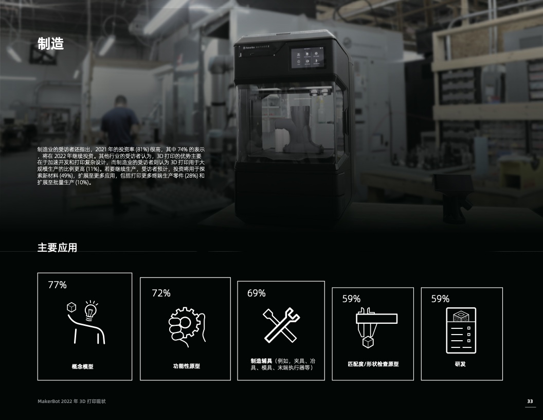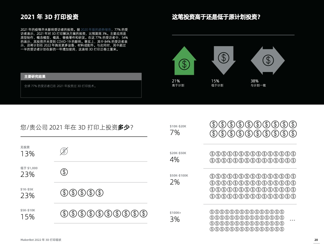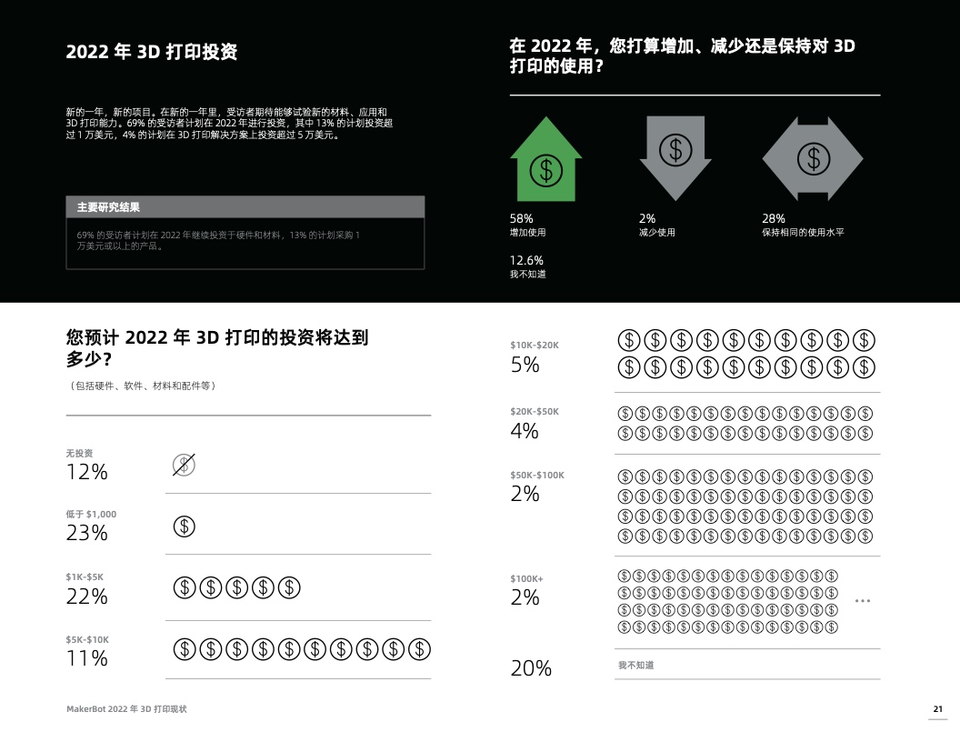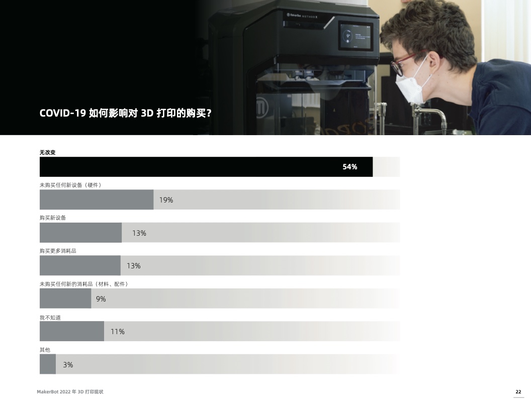 在去年的调查中,74%的受访者表示他们计划在2022年投资新的3D打印技术,对该领域持乐观态度。此外,今年的调查结果显示,去年受访的3D打印投资者中有84%表示他们计划在2022年加购设备、材料和配件,以应对新的应用需求,无论是原型制作、模具制作,甚至是大规模生产。