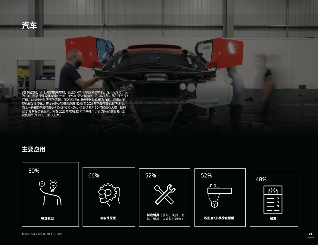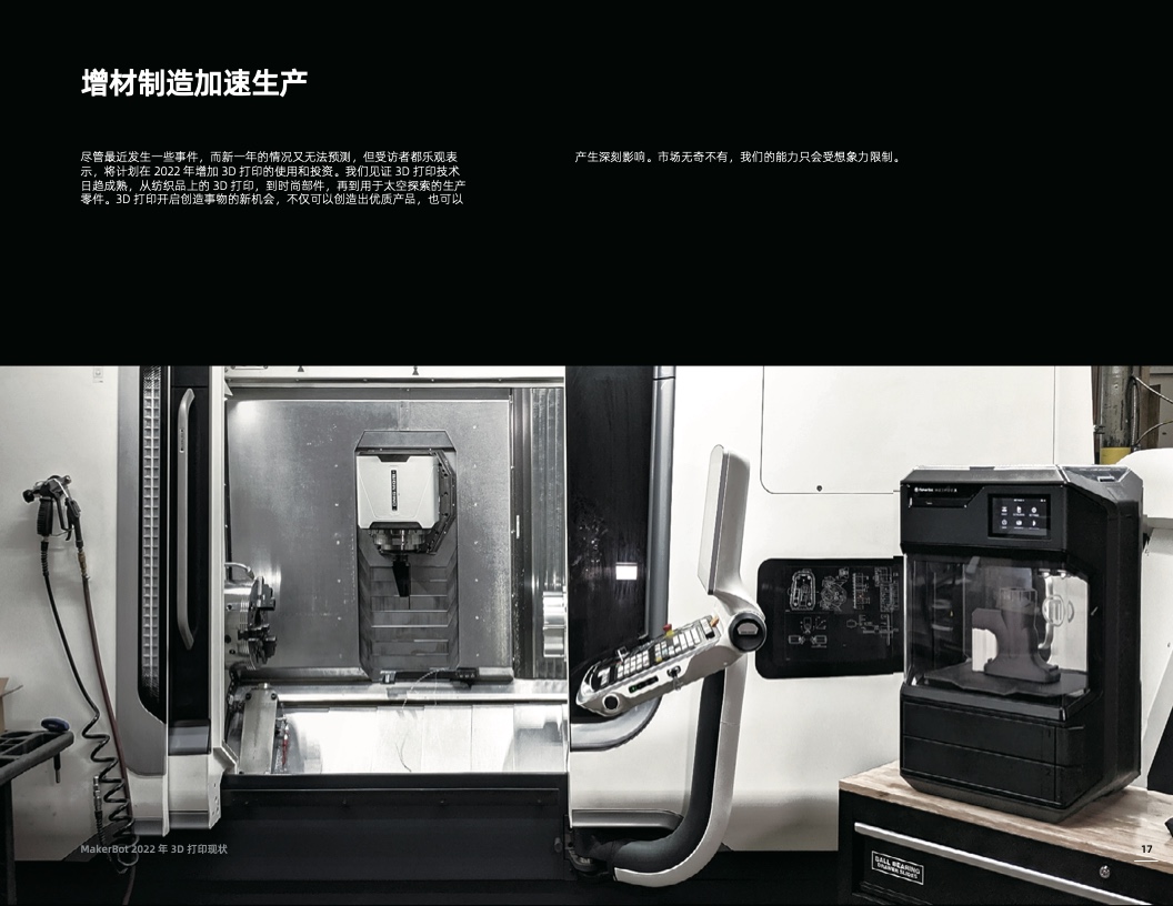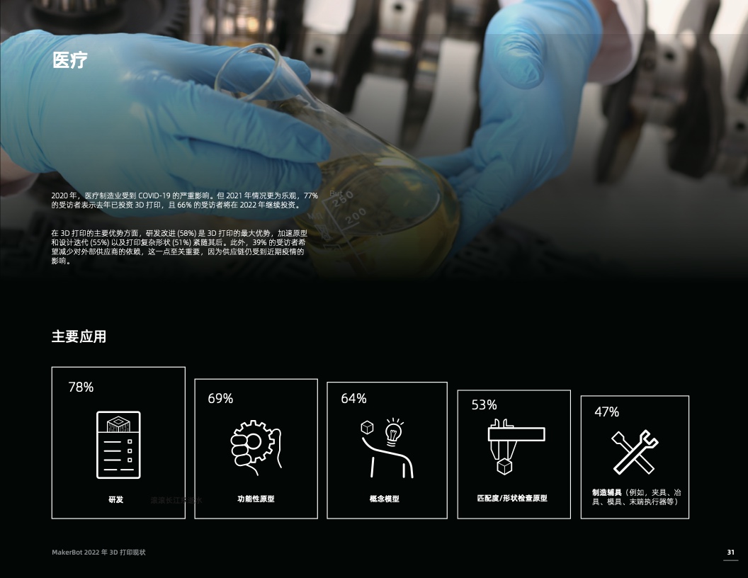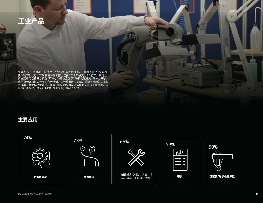在去年的调查中,74%的受访者表示他们计划在2022年投资新的3D打印技术,对该领域持乐观态度。此外,今年的调查结果显示,去年受访的3D打印投资者中有84%表示他们计划在2022年加购设备、材料和配件,以应对新的应用需求,无论是原型制作、模具制作,甚至是大规模生产。