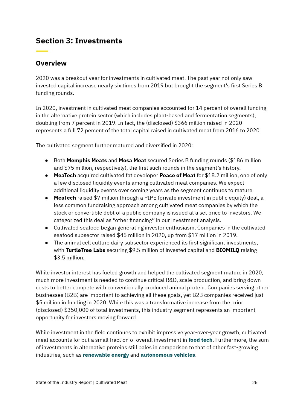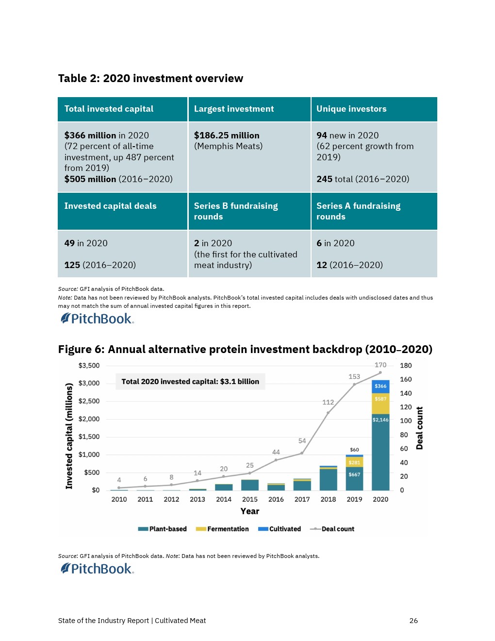 2020年,这一新兴领域的投资额突破3.5亿美元,几乎是此前该行业累计投资额的两倍。2020年,该行业迎来了第一笔B轮融资,以及美国和欧盟的第一轮实质性公共部门研发融资。在替代蛋白质领域,人造肉占私营部门年度总投资的14%。