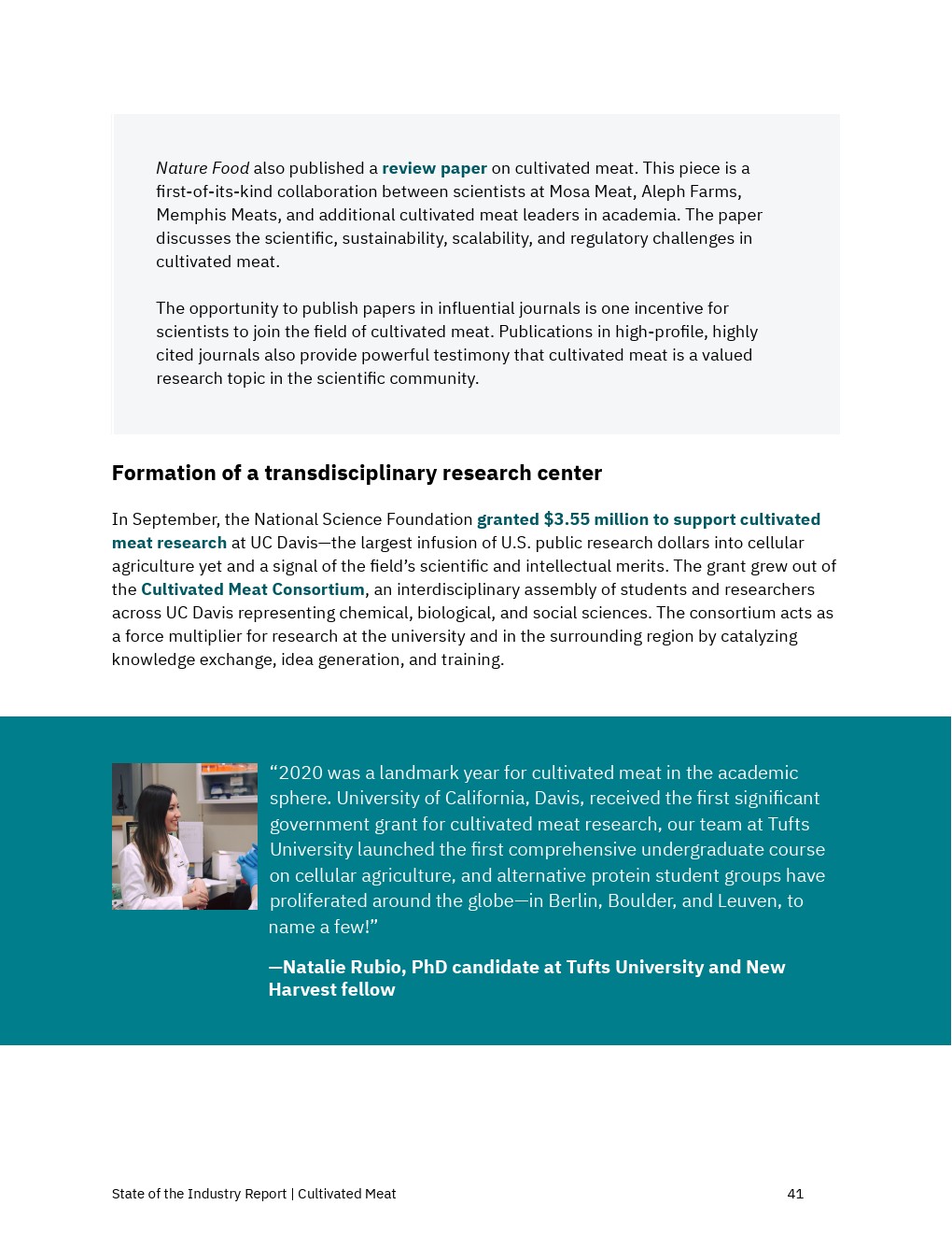 人造肉越来越被国际科学界公认为一个有价值的研究课题。公共部门开始资助人造肉研究中心。这些努力发展了一个依托学术生态系统的人造肉研究氛围,也激发了一个名副其实的浪潮。这些将加快人造肉商业化。