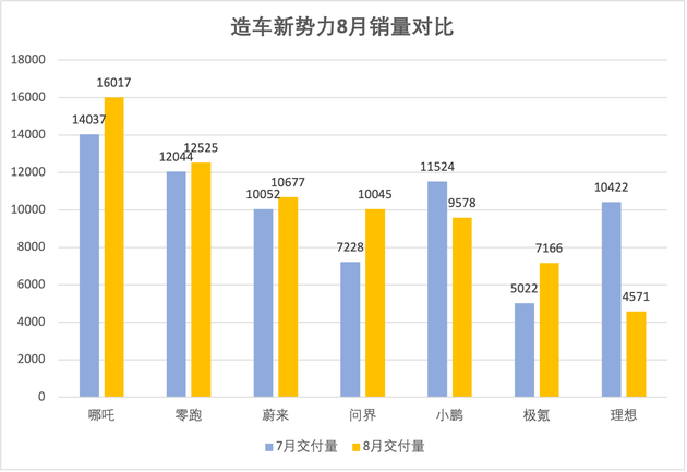 极氪旗下的极氪001车型再创单月交付新高,8月交付7166辆,环比增长42.7%;自去年第四季度开启交付以来,其历史累计交付量达到3.7万辆。值得注意的是,随着二线新势力品牌不减的增势,今年全年销冠也有可能易主。1-8月,哪吒汽车累计交付9.32万台,超过了累计交付9万台的小鹏,领跑目前造车新势力销量榜。
