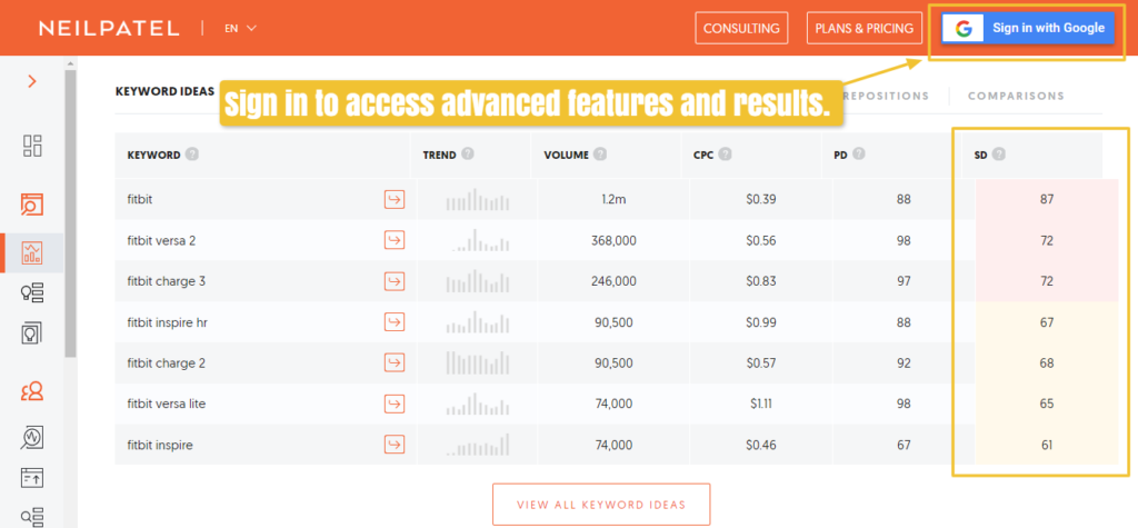 免费注册可让您访问更多结果,扩大资源,从而有助于扩展关键字和SEO策略。