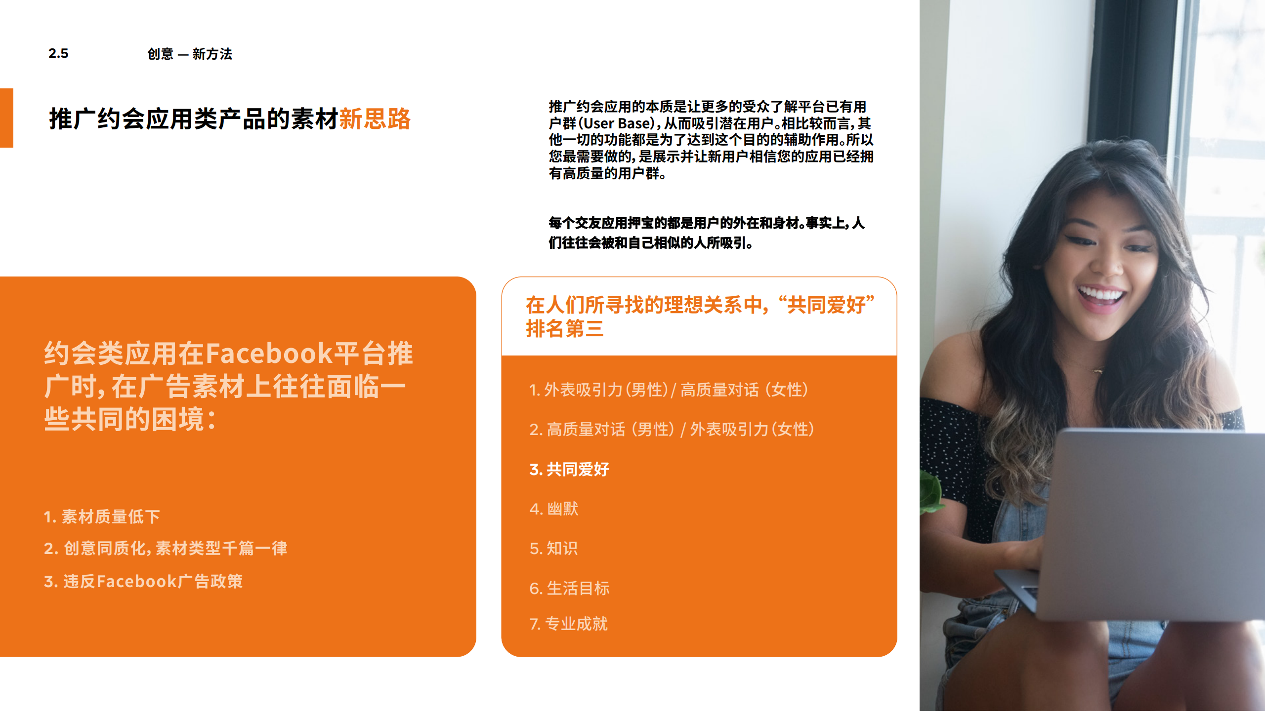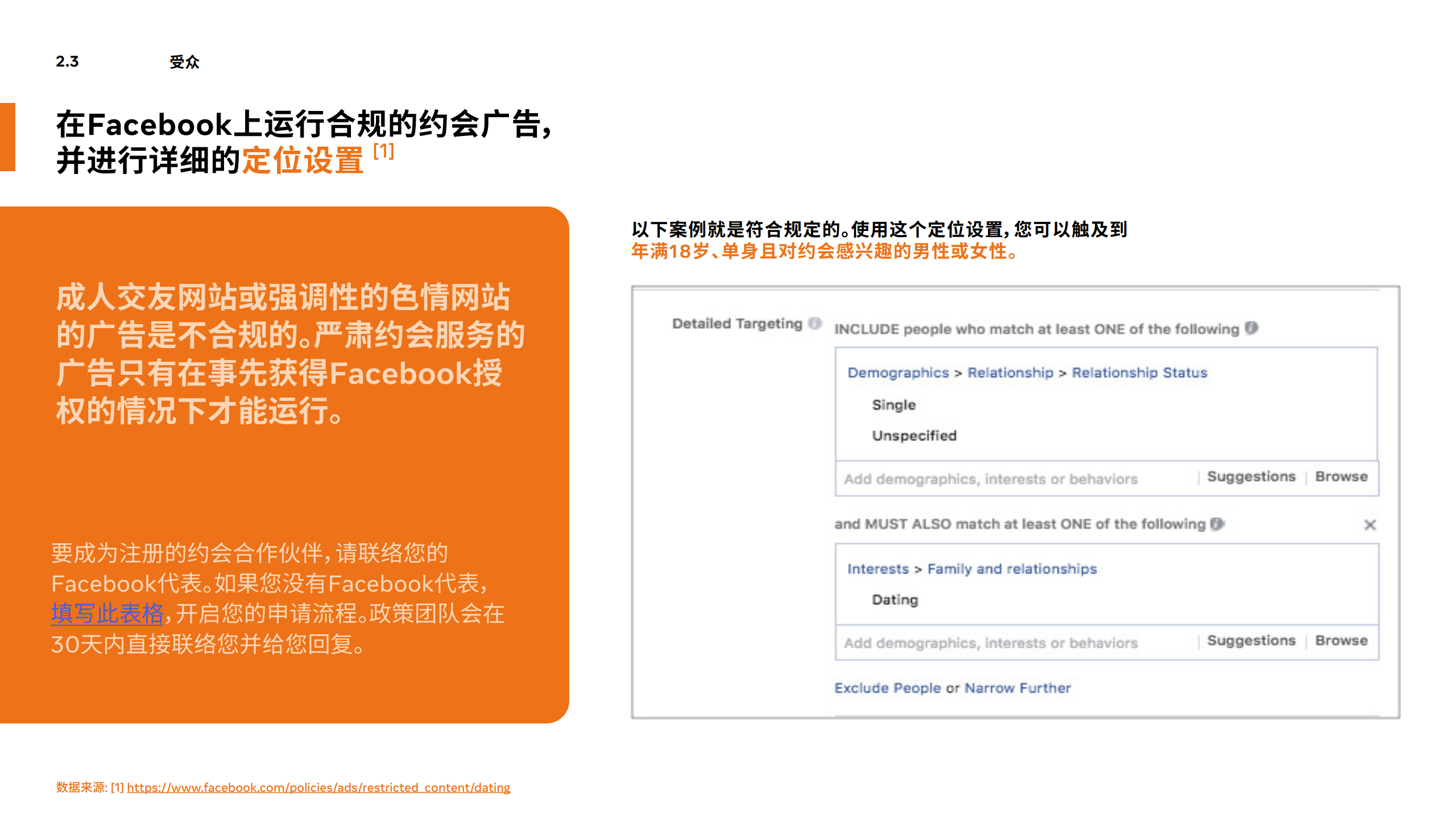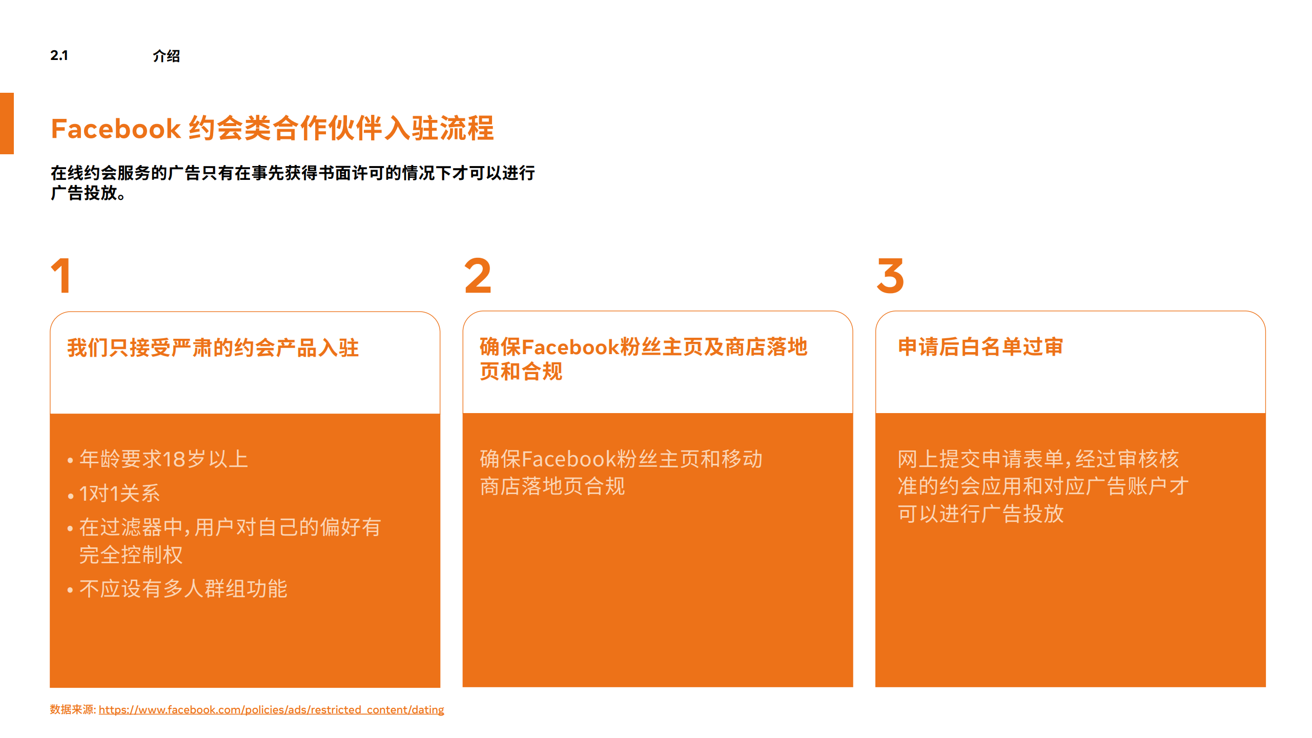 考虑到约会这一类别的特殊性,Facebook为约会类产品入驻制定了一套严格的筛选程序,只有事先获得Facebook书面许可的约会类广告才能出现在Facebook产品中。