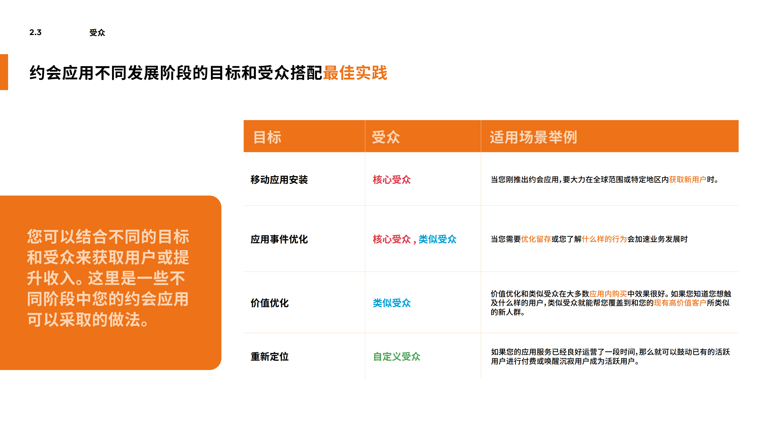 除此之外,这本白皮书还就广告版位的选择、打造有创意的素材、让创意素材更适合移动端等多个方面提供了简单明了的建议,从挖掘合适的客户、提高客户参与度、拉升客户留存到提升客户终身价值,提供一条龙的实操手段。
