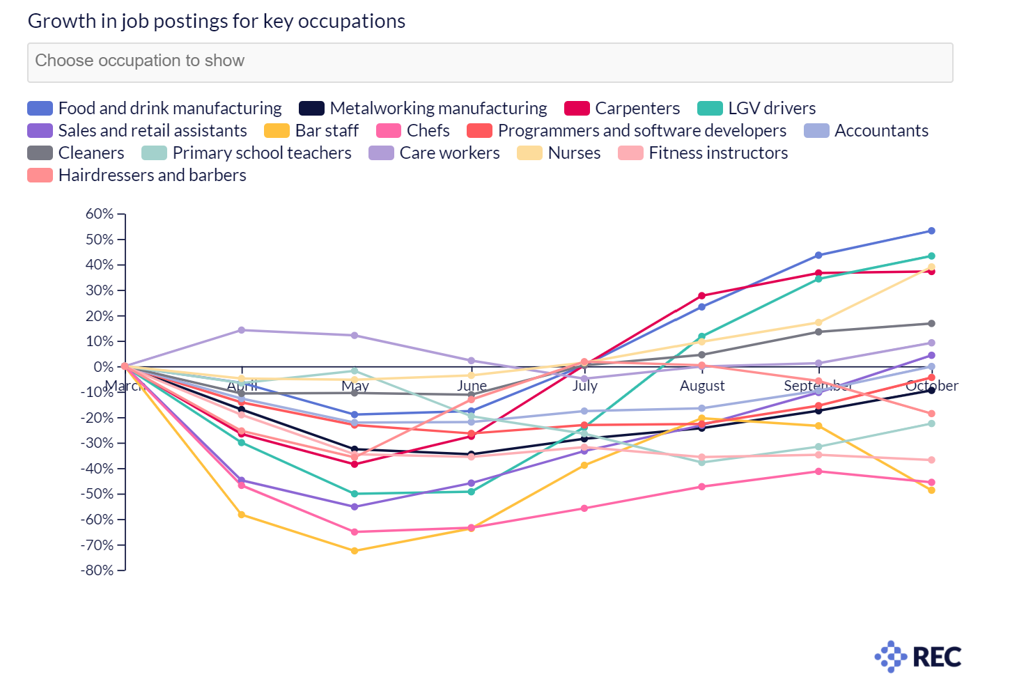 2020年11月的第一周推出了新的英国锁定措施,同时,发布了136万个职位。但是,正如REC最新的工作复苏追踪器(Jobs Recovery Tracker)所强调的那样,这种复苏并未在英国劳动力市场的不同地区和行业平均分配。