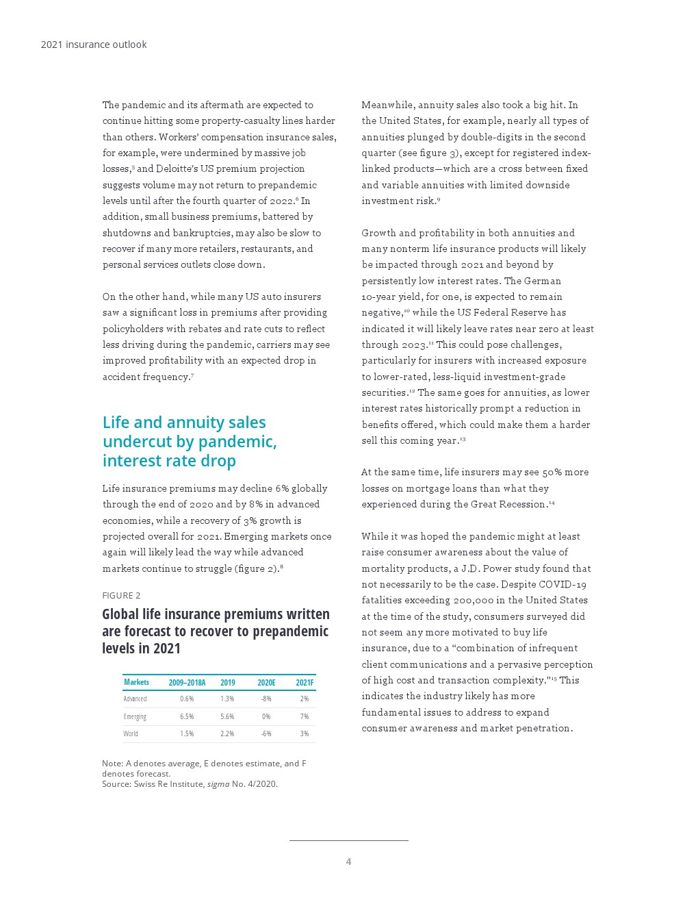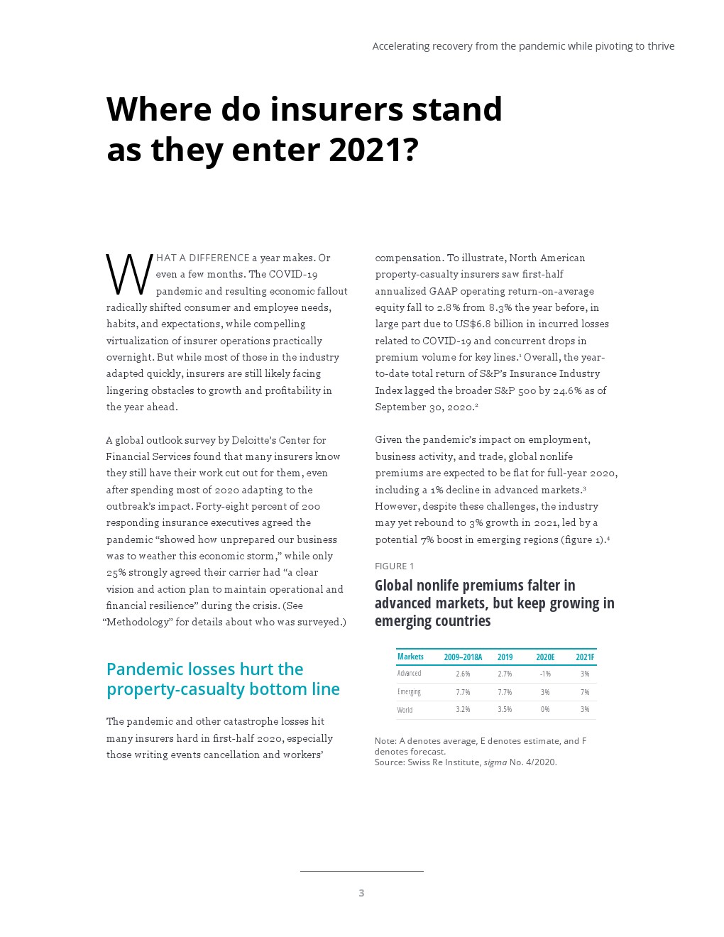 大流行和其他灾难性损失在2020年上半年严重打击了许多保险公司,尤其是那些取消事件和赔偿工人的保险公司。例如,北美财产保险公司的GAAP上半年年度化经营平均回报率从上年的8.3%降至2.8%,这在很大程度上与COVID-19有关。截至2020年9月30日,标准普尔保险业指数的总回报率落后于标准普尔500指数24.6%。预计全球2020年非人寿险保费收入将持平,其中先进市场将下降1%。尽管面临这些挑战,2021年该行业仍可能反弹至3%,得益于新兴市场的增长(7%)。