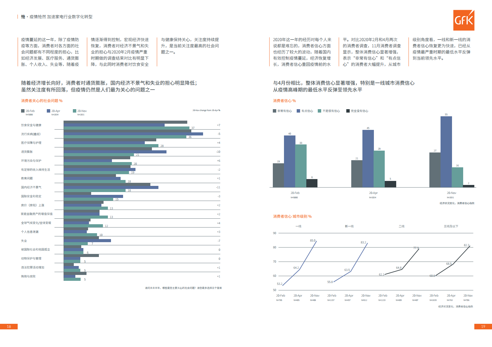 疫情期间,全国上下众志成城抗击疫情,国内爱国情绪高涨,对国货的支持度进一步攀升。根据GfK消费者研究数据,2020年11月,持“更倾向于选择本土品牌,支持国货,为国家贡献一份自己的力量”观点的消费者占比达68.9%,其中一线城市和“00后”消费者对国货抱有更积极正面的态度,品牌不再成为国产家电高端化的障碍。