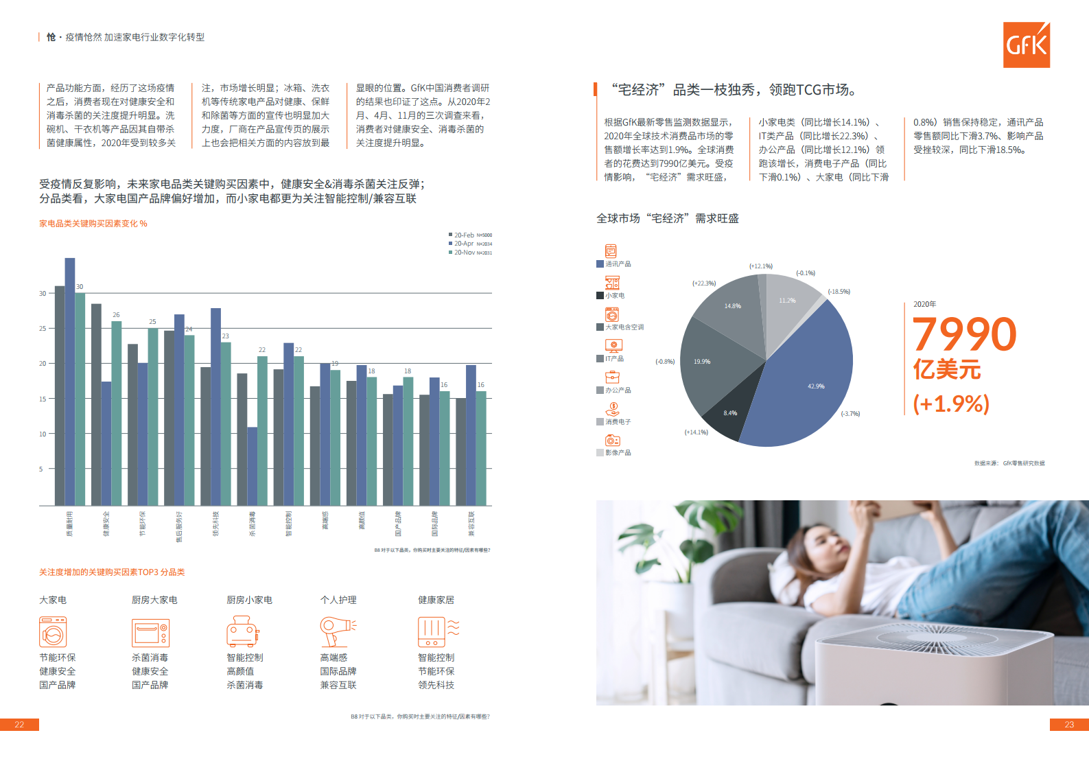 受疫情影响,消费者对健康和高品质生活的重视程度提高,对厨电和健康清洁类小家电产品需求增加,推动了食物料理机、洗碗机、蒸箱等新兴品类零售量的快速增长。