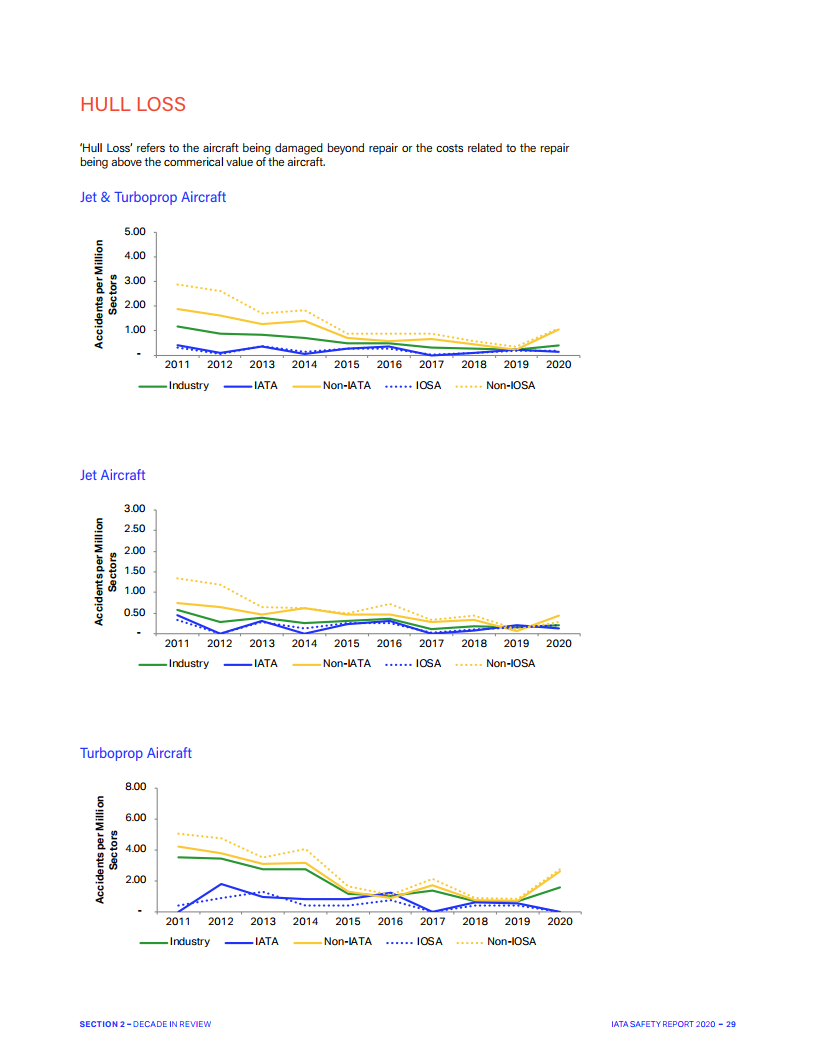 所以,即使2020年的事故数量与2019年相比较低,但事故率有所提高,从2019年的百万次航班1.11起事故增加到2020年的1.71起。然而,2016-2020五年间的平均事故率为每百万次航班1.38起,低于2011-2015五年间的2.24起。