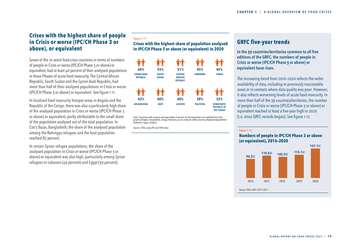 突发性粮食不安全对非洲国家的影响尤为明显。2020年,全世界面临突发粮食不安全问题的人口中有三分之二身处非洲大陆,近9800万人。世界其他地区亦未能幸免,也门、阿富汗、叙利亚和海地等国去年粮食危机的严重程度居全球前十。