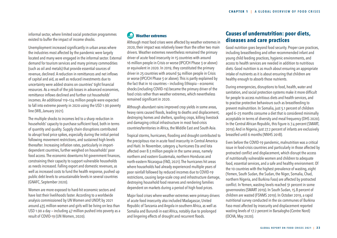 经济冲击——以新冠疫情为主的各种原因对经济造成严重冲击。从受影响的人数和国家来看,经济冲击已经取代气候事件成为突发粮食不安全的第二大成因(从2019年的8个国家的2400万人上升到17个国家/地区4000万人);