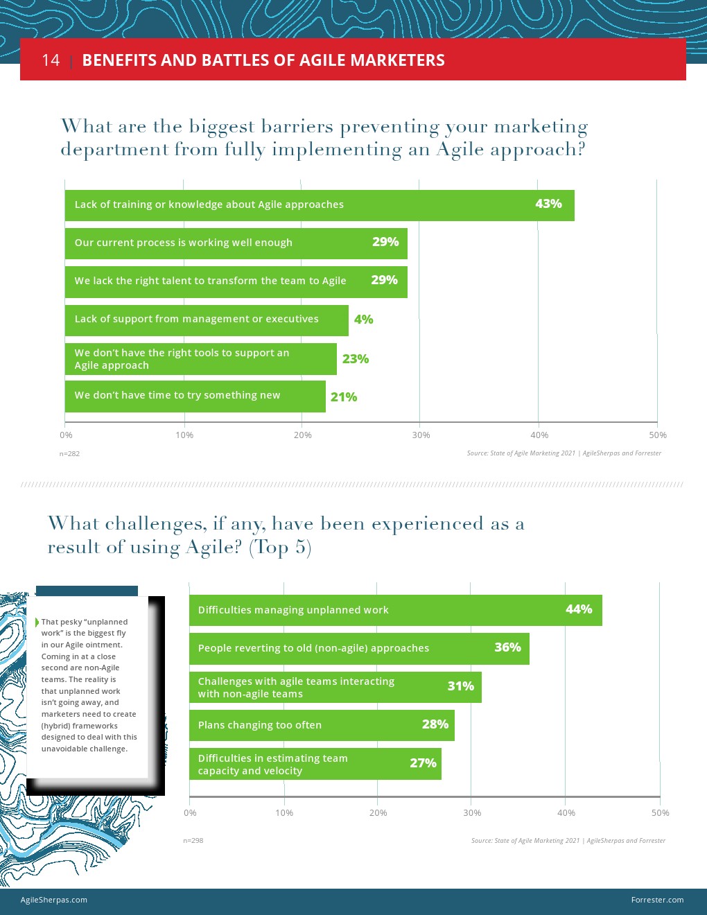 但是,敏捷营销也存在挑战,最主要的包括缺乏相关培训和知识(43%),缺乏合适的人才(29%)。