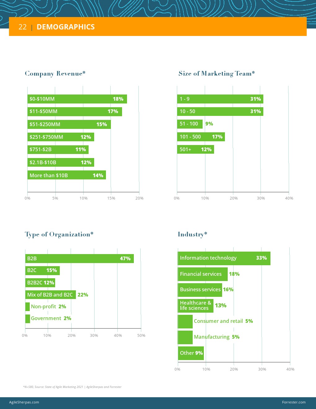 那些采用敏捷营销的受访者在多个营销职能中使用敏捷策略,如创意服务、内容创建和运营(77%)、需求和ABM(76%)、网站(72%)、社交媒体(66%)以及投资组合和产品营销(62%)。尽管超过一半的受访者在渠道营销(56%)、广告(54%)、客户参与(54%)和活动(52%)中使用敏捷策略,但在品牌管理(44%)活动中使用的人似乎较少。