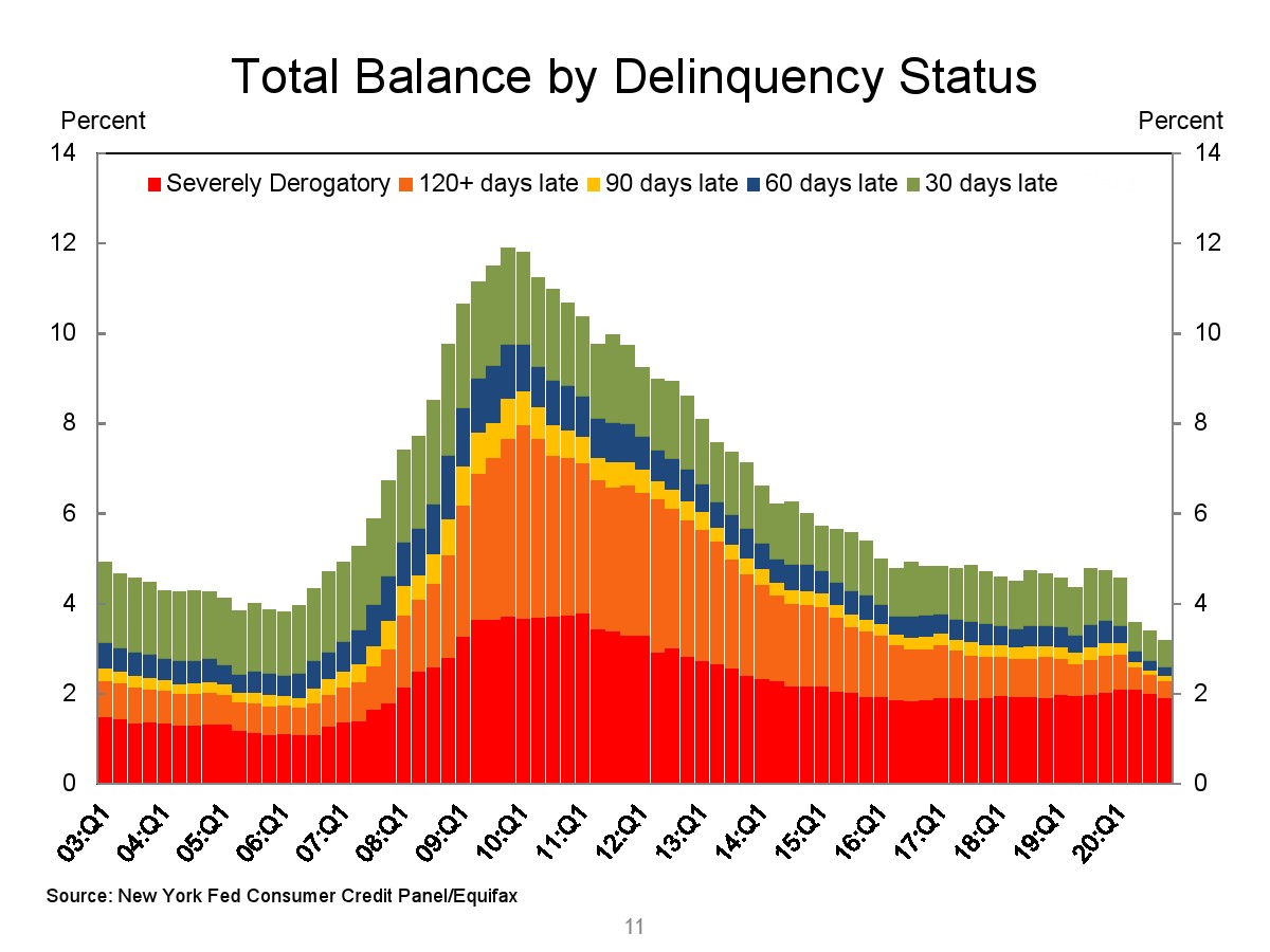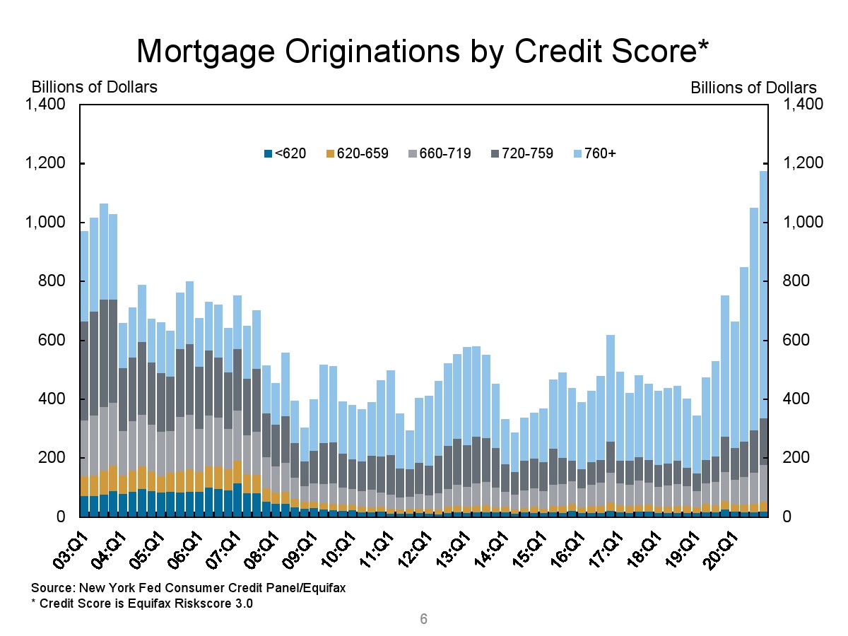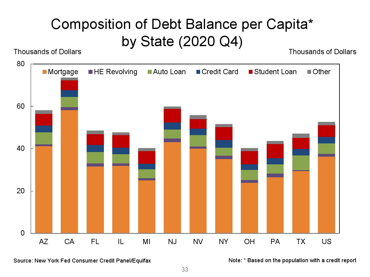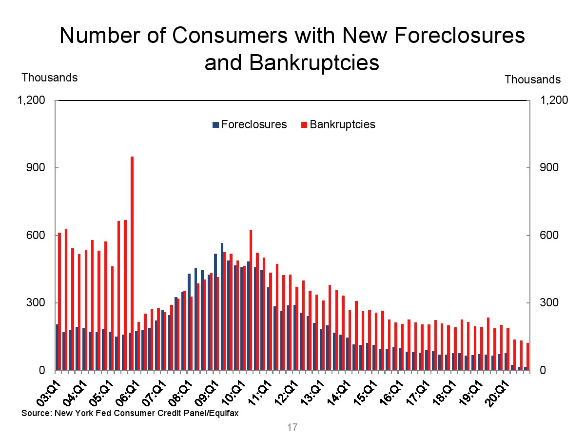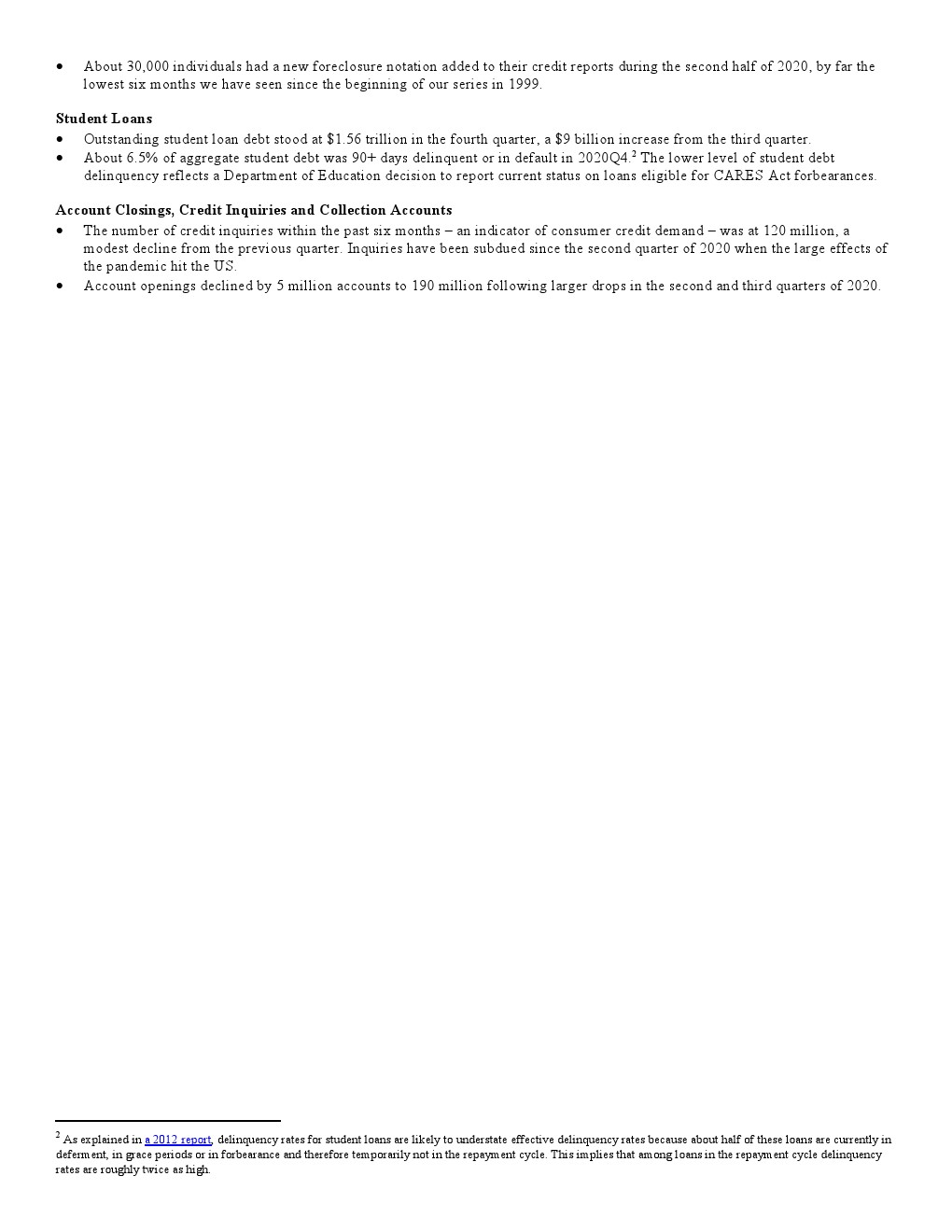 2020年第四季度,新发行的房屋抵押贷款债务为1.2万亿美元。2020年下半年,大约30,000个人的信用报告中添加了新的止赎抵押品赎回权。第四季度未偿还的学生贷款债务为1.56万亿美元,比第三季度增加了90亿美元。2020年第四季度,约有6.5%的学生债务拖欠90天以上或违约。