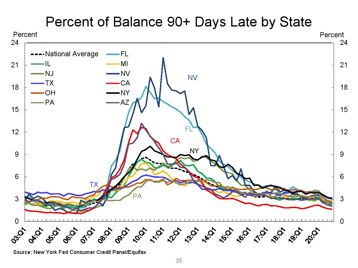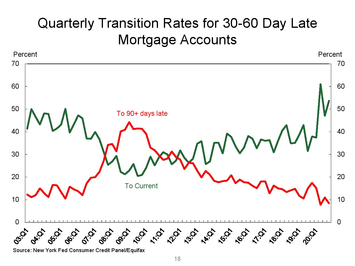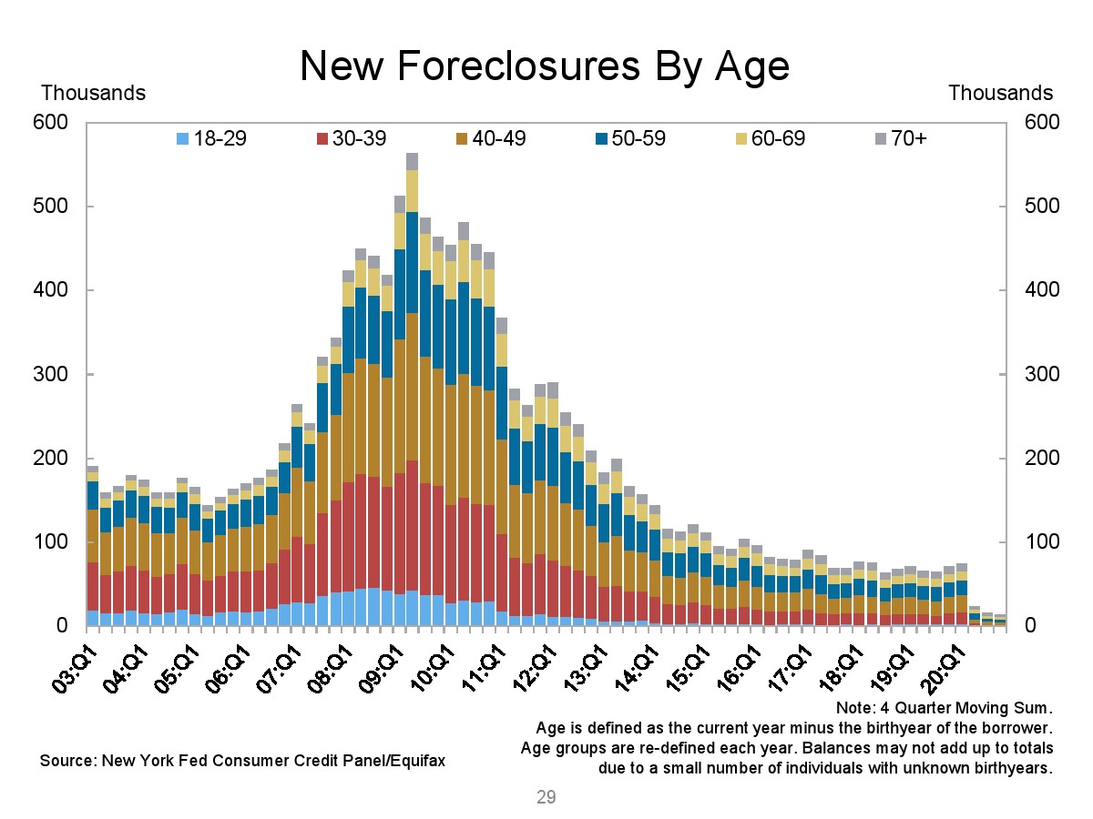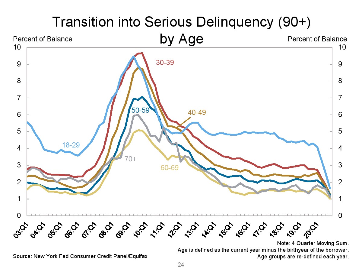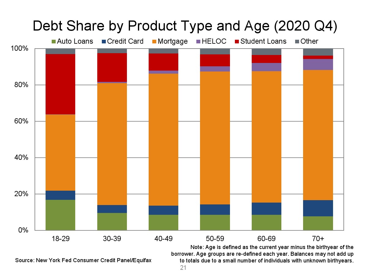 2020年第四季度,新发行的房屋抵押贷款债务为1.2万亿美元。2020年下半年,大约30,000个人的信用报告中添加了新的止赎抵押品赎回权。第四季度未偿还的学生贷款债务为1.56万亿美元,比第三季度增加了90亿美元。2020年第四季度,约有6.5%的学生债务拖欠90天以上或违约。