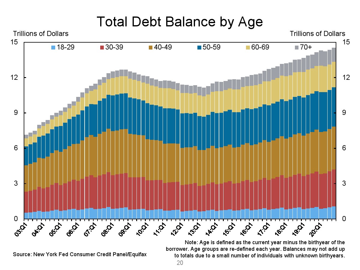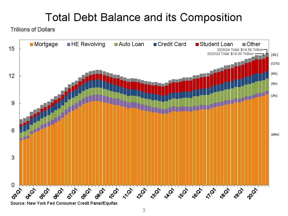 纽约联邦储备银行发布了“2020年第四季度家庭债务和信贷报告”,第四季度美国家庭债务增长至14.56万亿美元。