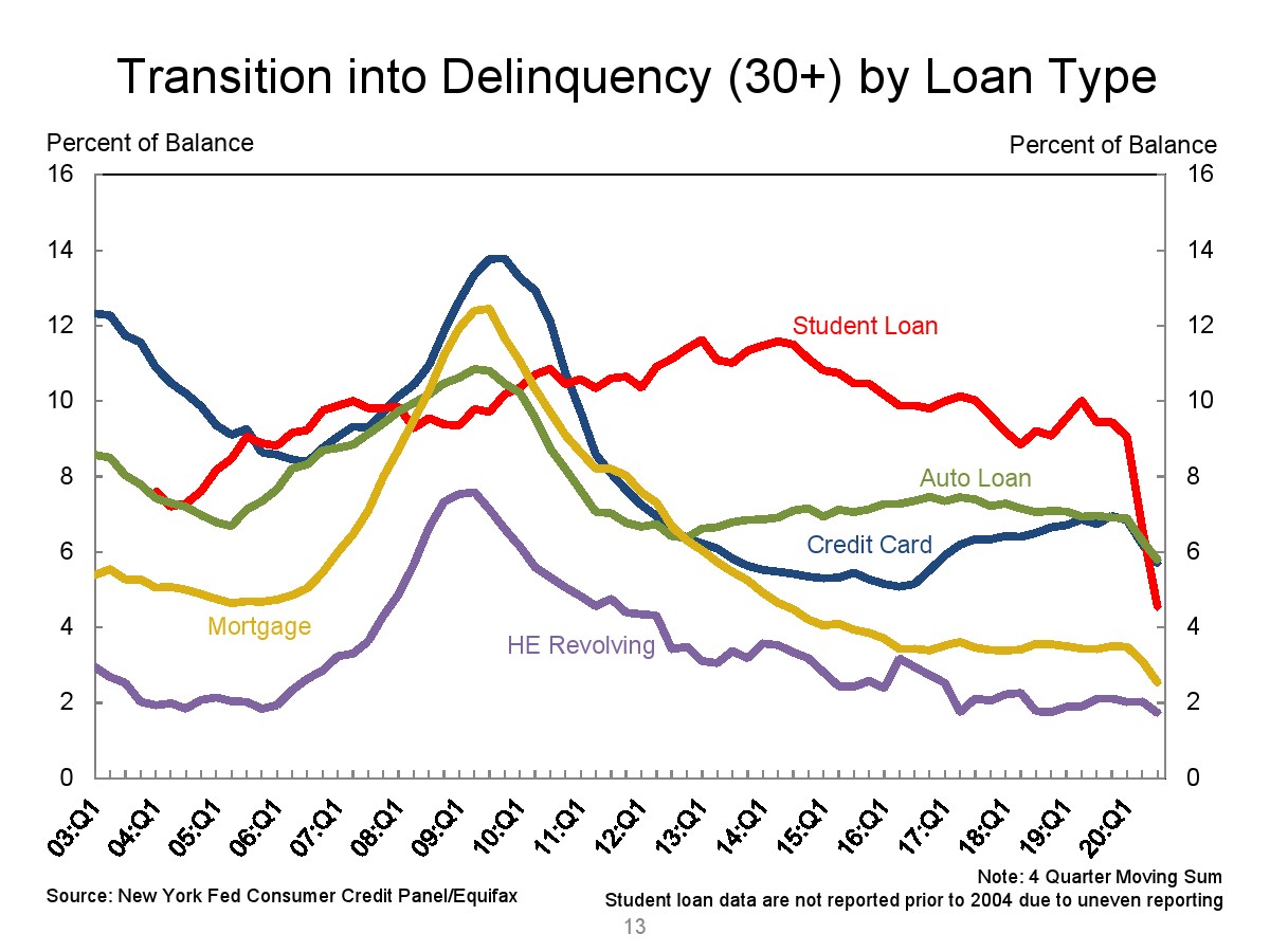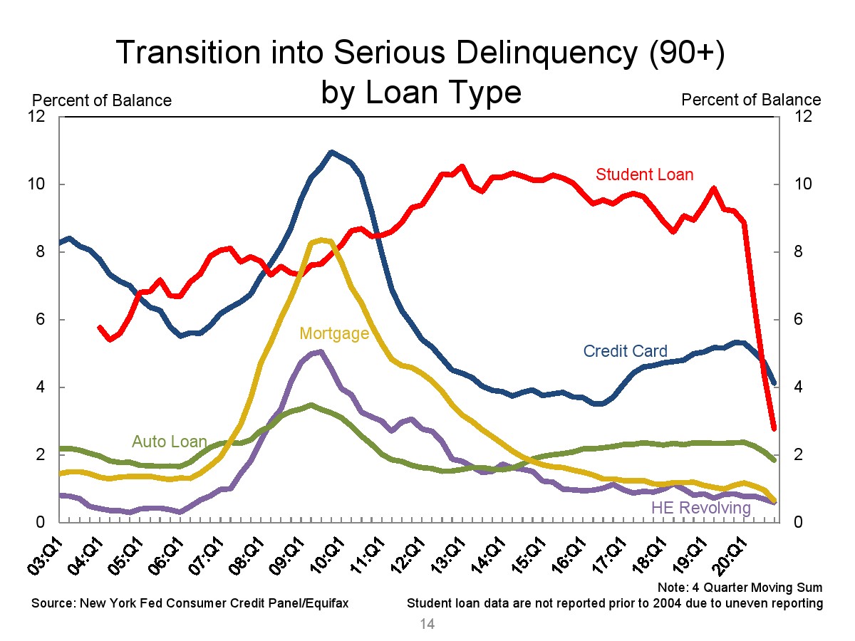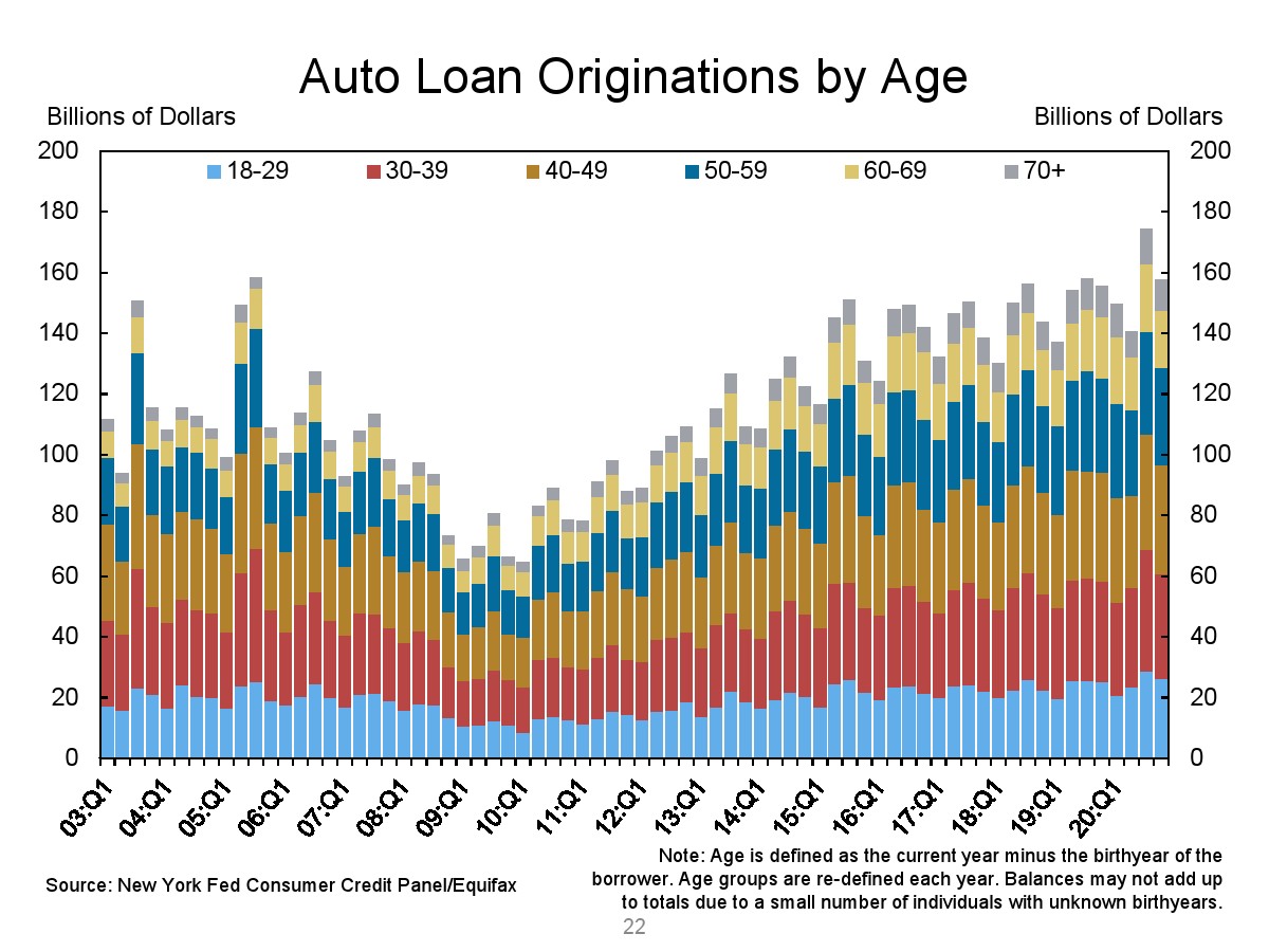 第四季度汽车贷款余额增加了140亿美元。学生贷款余额增加了90亿美元。总的来说,非住房贷款余额增加了370亿美元,但仍比2019年第四季度的水平低310亿美元。