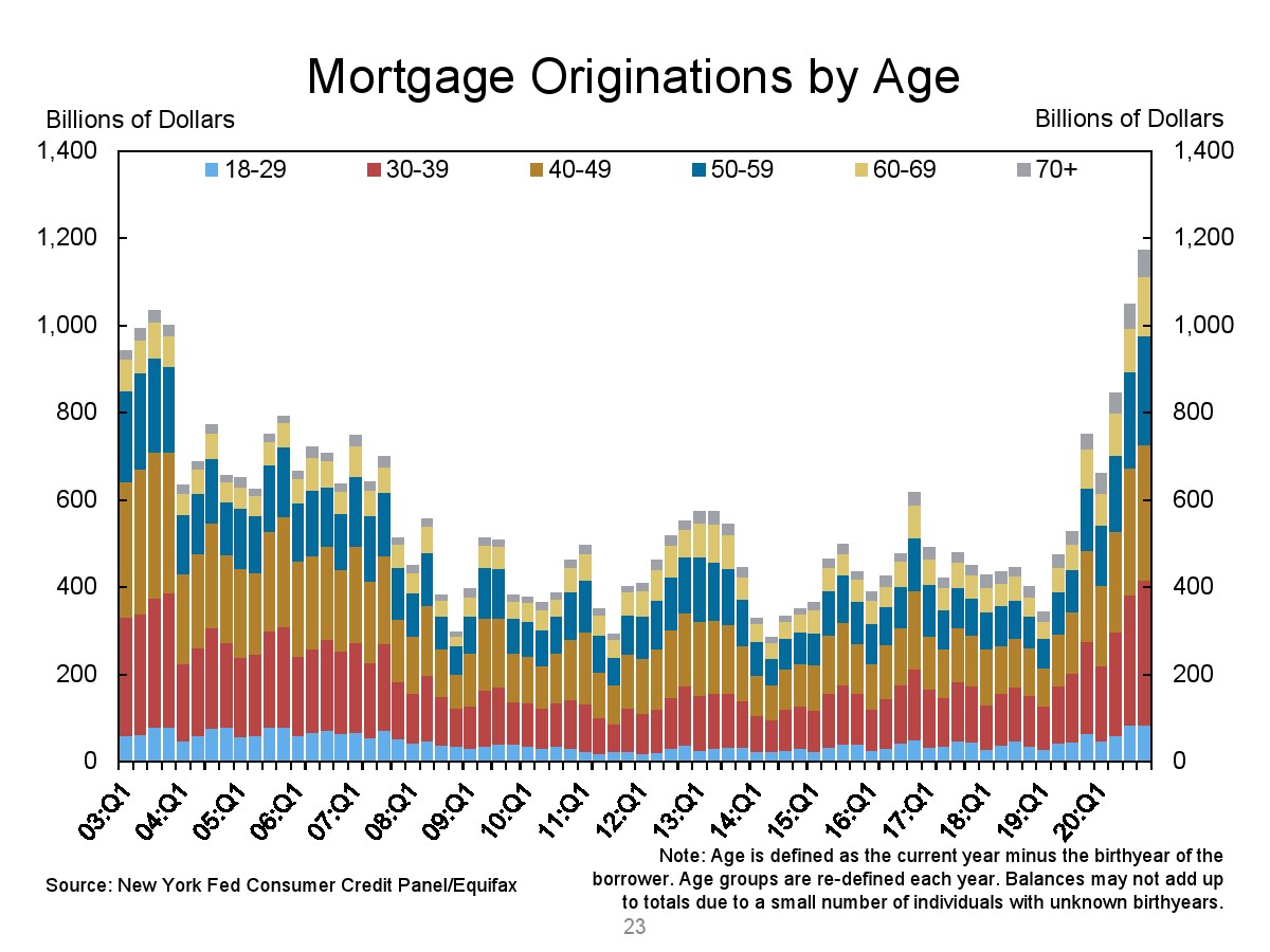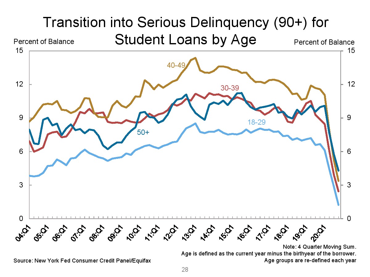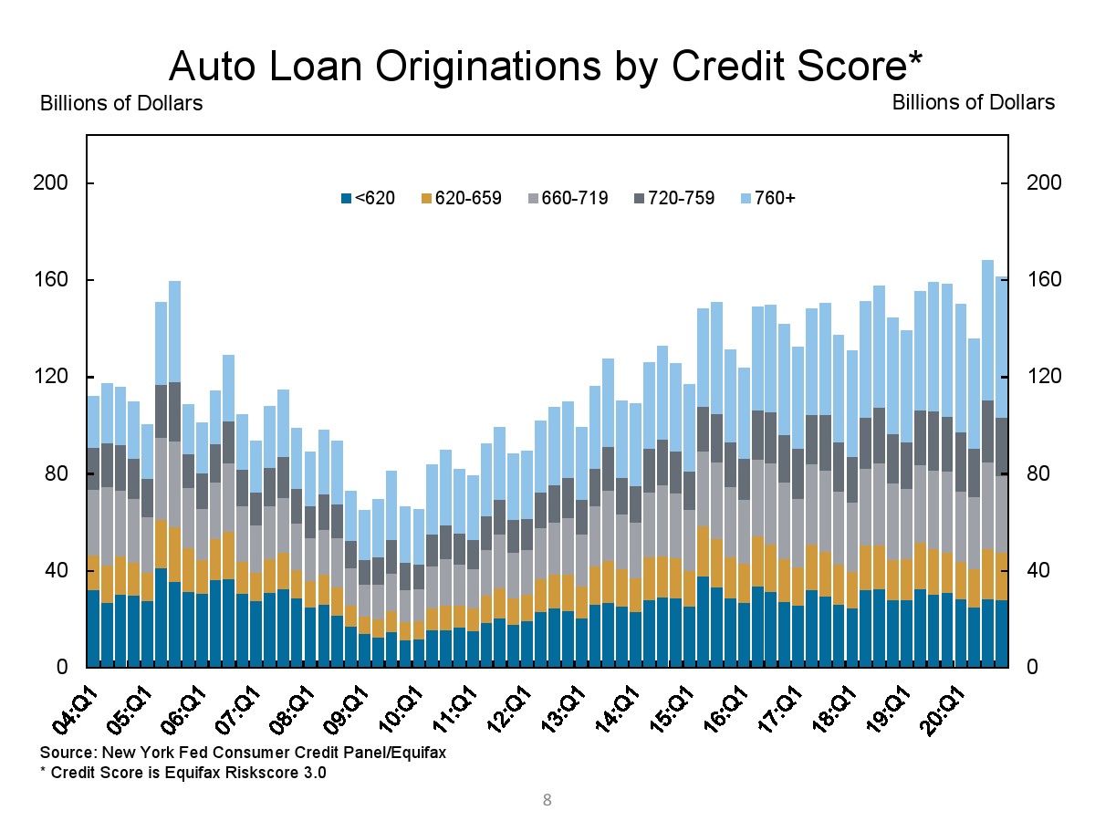 第四季度汽车贷款余额增加了140亿美元。学生贷款余额增加了90亿美元。总的来说,非住房贷款余额增加了370亿美元,但仍比2019年第四季度的水平低310亿美元。