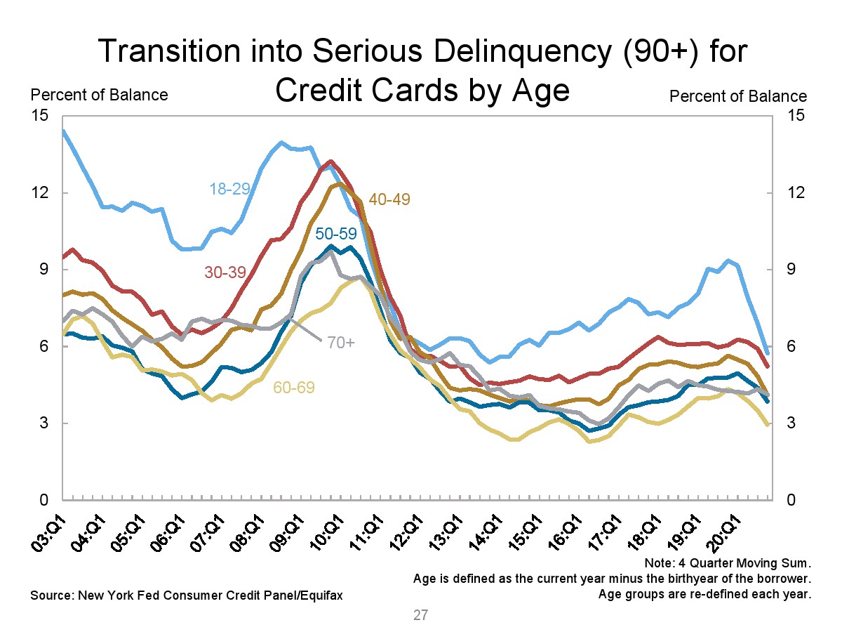 第四季度,信用卡余额增加了120亿美元,这是继第二季度760亿美元的大幅萎缩和第三季度100亿美元的减少之后的温和季节性增长。信用卡余额比2019年底减少1080亿美元,这是自1999年以来的最大年度下降,与消费者支出以及持卡人还款持续疲软一致。