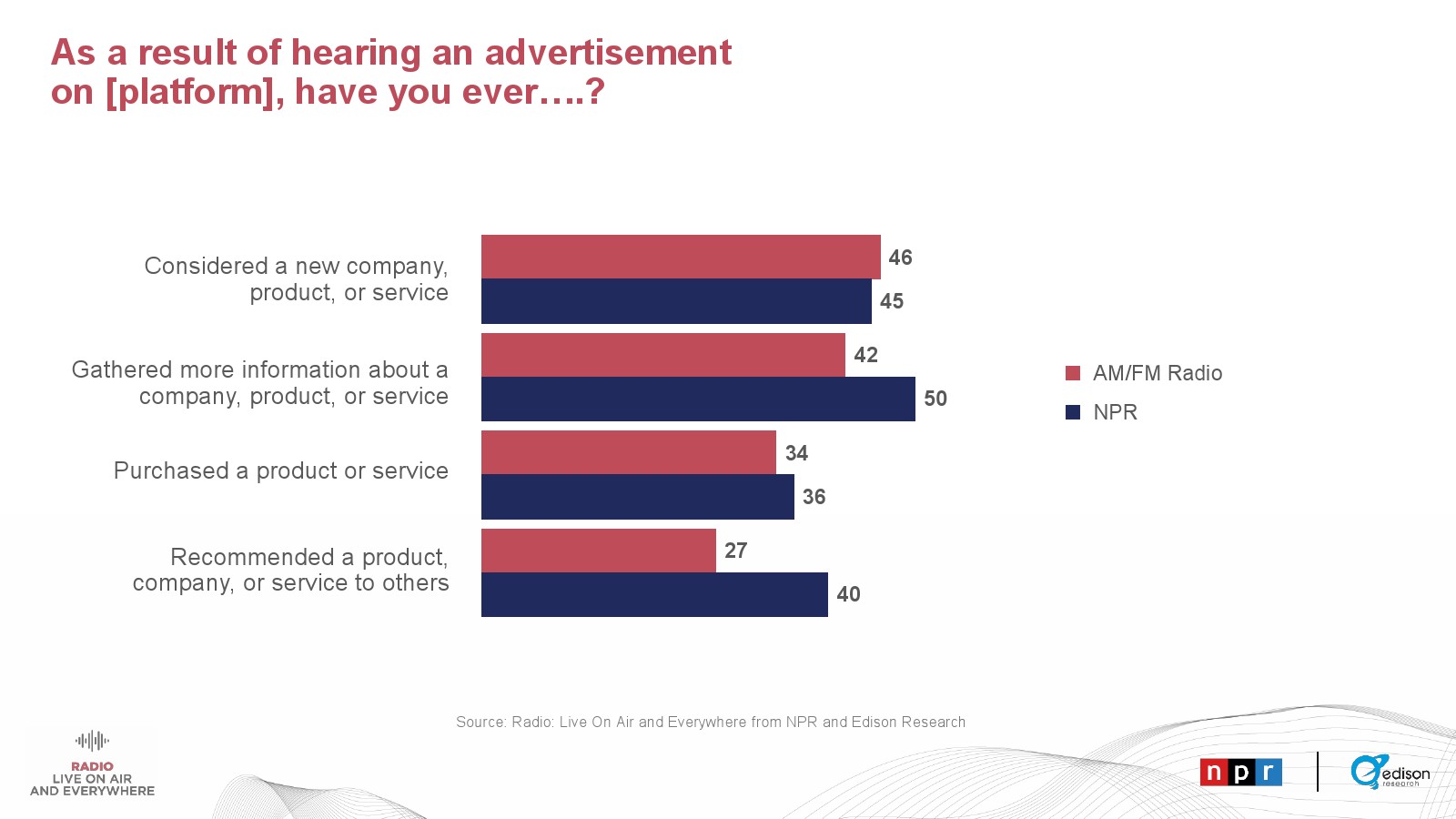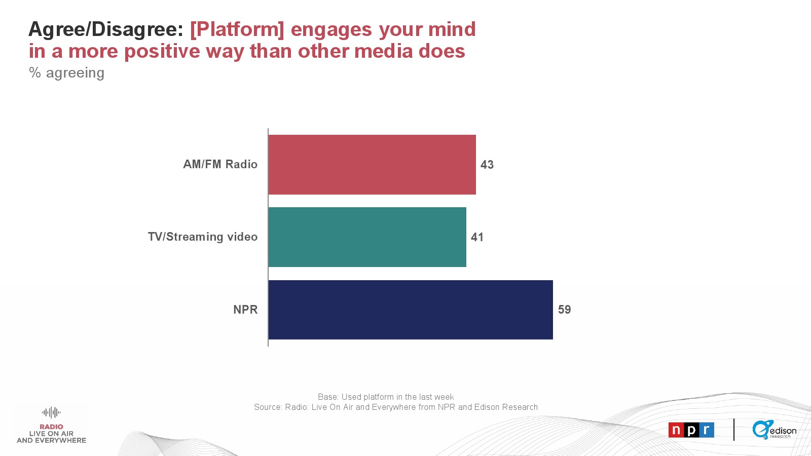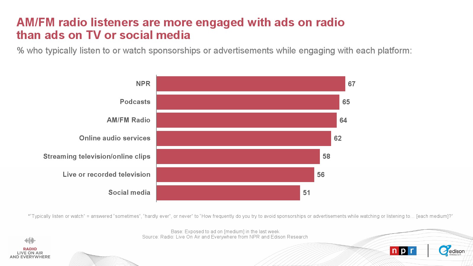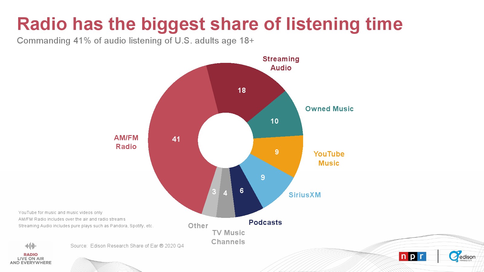 Edison发布了新报告“广播——直播和无处不在”。美国成年人收听音频的时间中有41%是通过AM/FM广播。