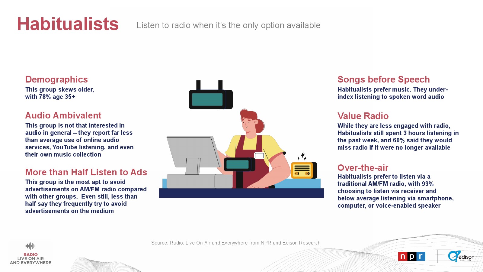 占广播听众总数的13%。习惯主义者只听AM/FM广播而没有其他选择。此外,他们对广播广告的接受度最低,只有58%的人在听广播的时候会听广告。