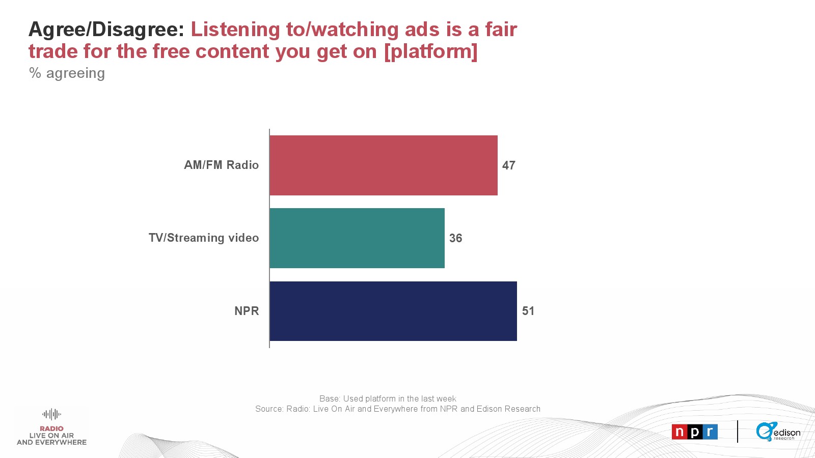 休闲听众对广播广告的接受度较低。59%的人通常在收听AM/FM广播时收听广告。