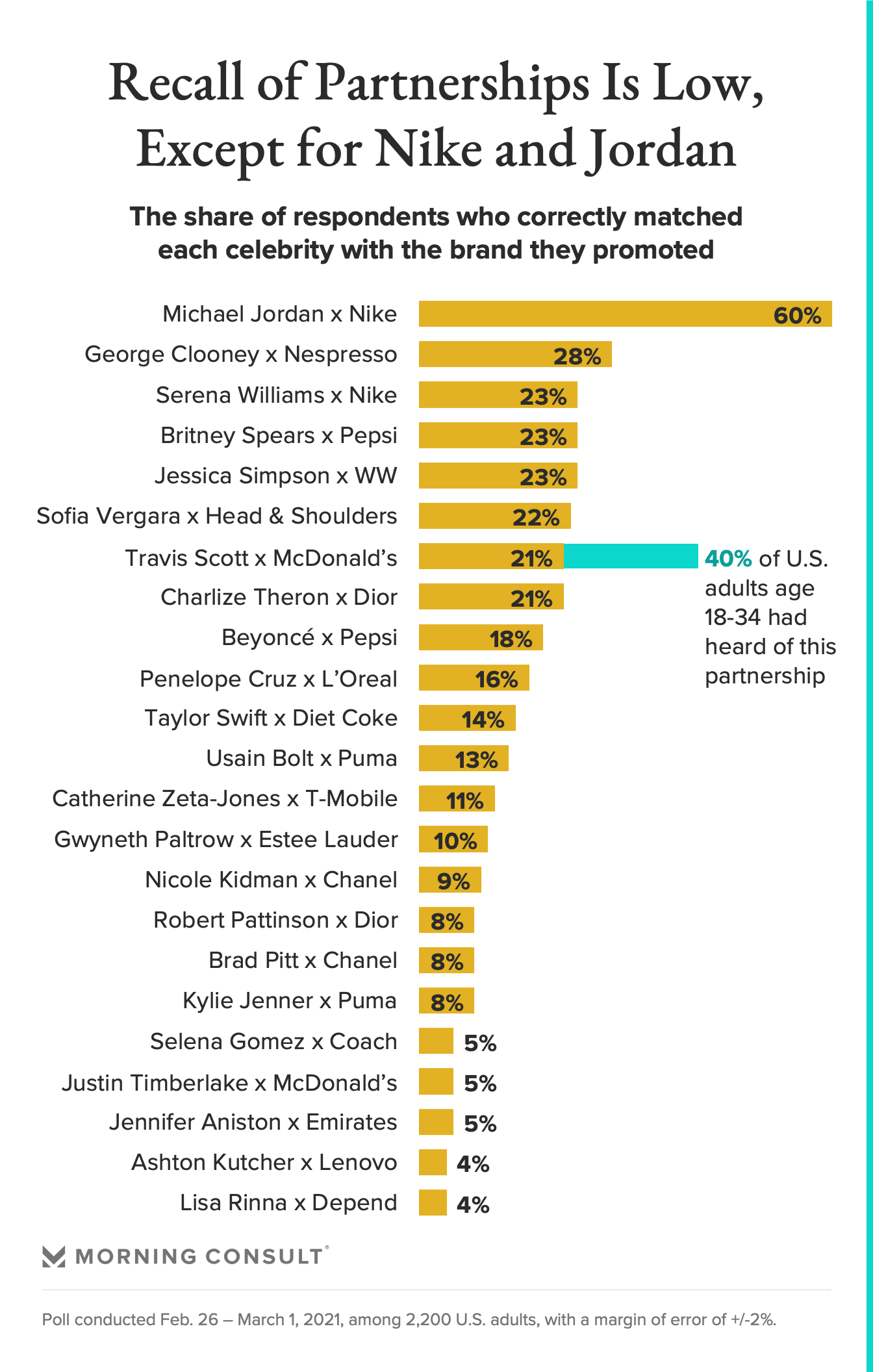 Morning Consult编制了一份名单,其中包括23位演员、歌手、运动员和意见领袖。1000名美国成年人被要求从五个可能的答案中选出一个正确的答案将名人与他们合作的品牌相匹配。