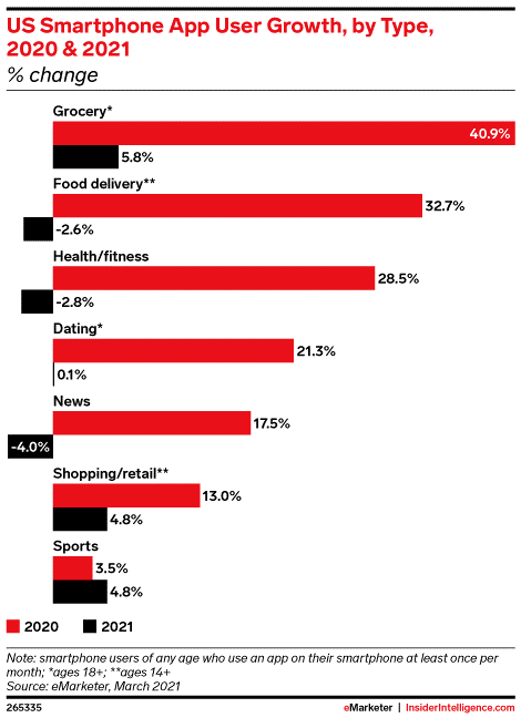 去年,随着越来越多的消费者在隔离期间使用他们的设备,许多移动应用类别都得到了增长。根据eMarketer对智能手机应用程序的估计,杂货、送餐和健康/健身应用程序是2020年增长最快的三个类别。