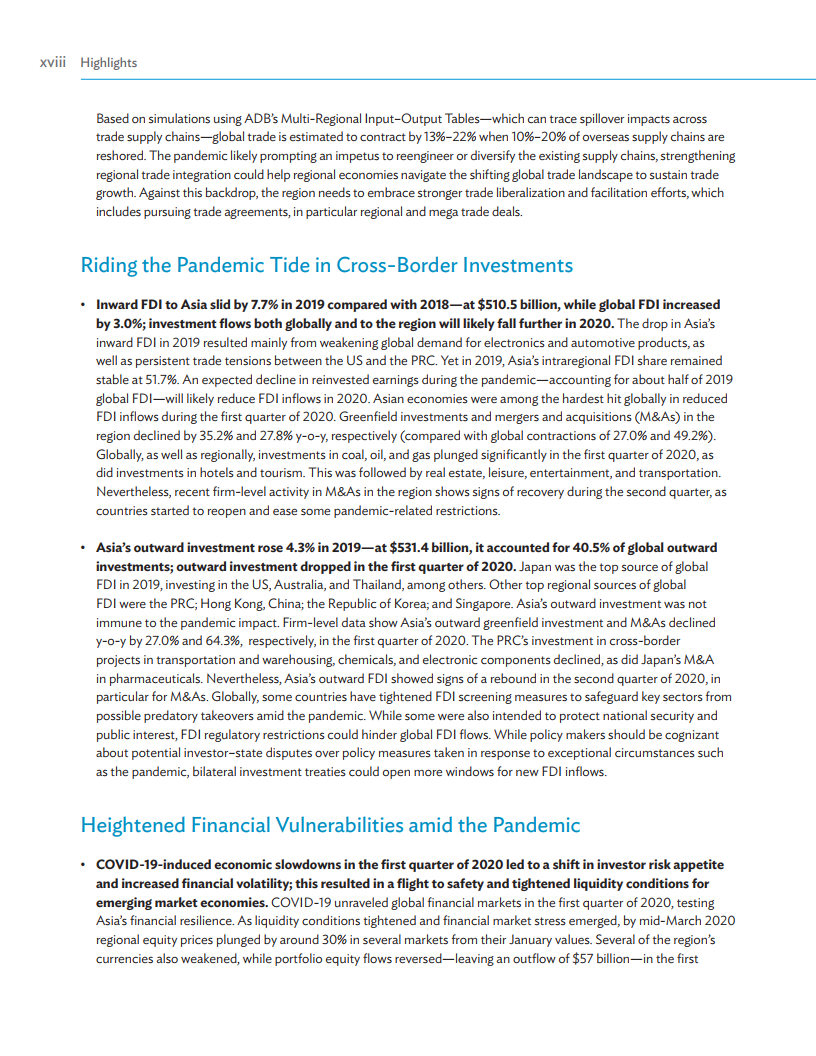 报告指出,虽然2020年上半年本地区贸易遭受重创,但预计其复苏速度将超出预期。2020年5月,亚洲商品贸易量同比下降10.1%,但随后逐渐反弹,2020年9月以来转为正增长。 2019年流入亚洲的外商直接投资为5,105亿美元,同比下降7.7%;预计2020年全球和流入本地区的投资将进一步下降。尽管如此,由于各国/地区开始解禁并放宽疫情管控措施,近期本地区的企业并购出现复苏迹象。