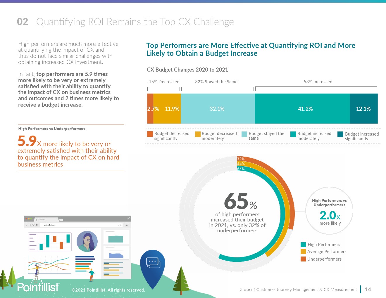 连续第三年,量化CX计划和投资ROI仍然是企业面临的最大挑战。这使得很难为进一步的投资构建一个商业案例。高绩效者在量化CX影响方面更为有效,在提高CX投资方面更为成功。
