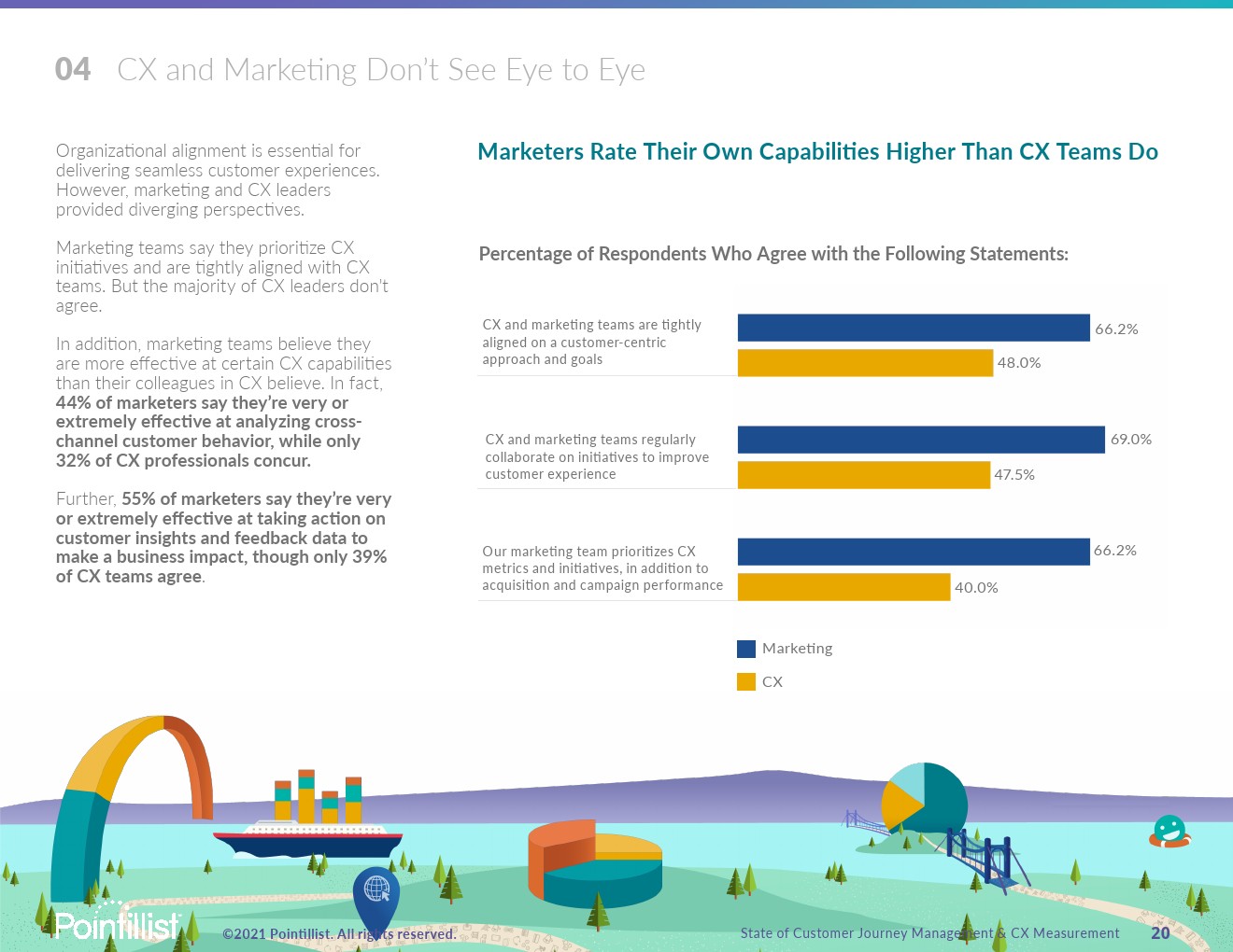 大多数营销团队认为他们与CX团队紧密合作,但大多数CX团队并不这么想。在表现最好的企业,CX团队和营销团队更有可能在以客户为中心的目标、方法、指标和计划上保持一致。