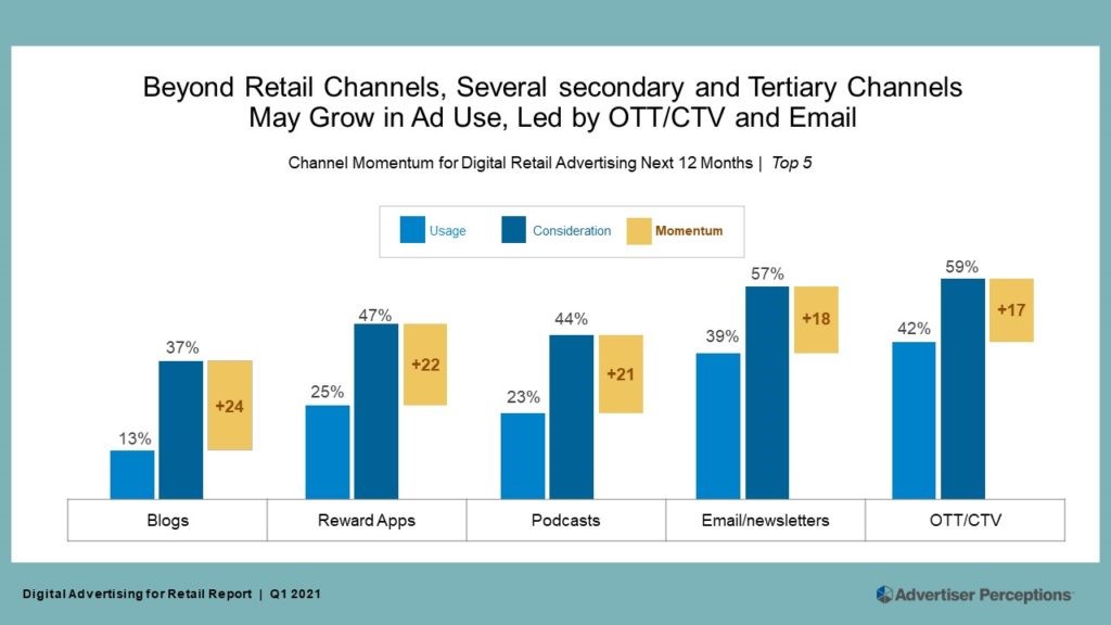 更重要的是,广告主在OTT/CTV的引领下,在二级和三级渠道投放更多的零售广告。播客、电子邮件通讯、会员应用程序和博客的发展势头也相当强劲。