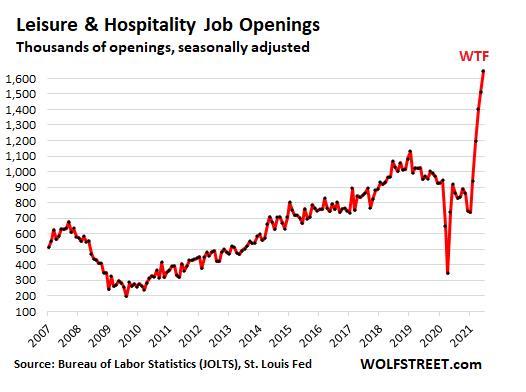 根据劳工统计局今天发布的报告,6月份未填补的职位空缺总数激增59万,经季节性调整后为1010万个,未经季节性调整的为1030万个,打破了之前的所有记录,比2019年6月增加了42%。