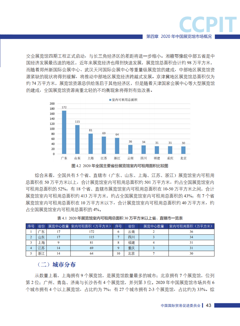 2020年,大型展览馆建设速度明显加快,预计未来国内大型展览馆需求将持续增长。从数量上看,全国共有30个展览馆室内可租用面积在10万平方米以上,约占全国展览馆总数量的21%,比2019年增加3个百分点。大中型展览馆占比的增长,一方面反映出中国展览馆建设水平的提高,展览馆规模不断增加;另一方面也反映出大中型展览馆在新冠肺炎疫情的冲击下抗压性更强,市场生存力更高。国家会展中心(天津)、济南绿地国际会展中心等展览馆建设陆续复工复产,郑州新国际会展中心、武汉天河国际会展中心、桂林新国际会展中心等重点展览馆建设项目也加快了项目建设步伐。2020年,深圳国际会展中心建成并投入使用后,珠三角经济区展览馆资源得以大幅提升,随着广交会展览馆四期工程正式启动,与长三角经济区的差距将进一步缩小。随着郑州新国际会展中心、武汉天河国际会展中心等重量级展览馆的陆续建成,中部地区展览馆资源紧缺的状况将得到缓解。京津冀地区随着国家会展中心(天津)等大型展览馆的建成,将有效改善全国展览馆资源南重北轻的不均衡现象。