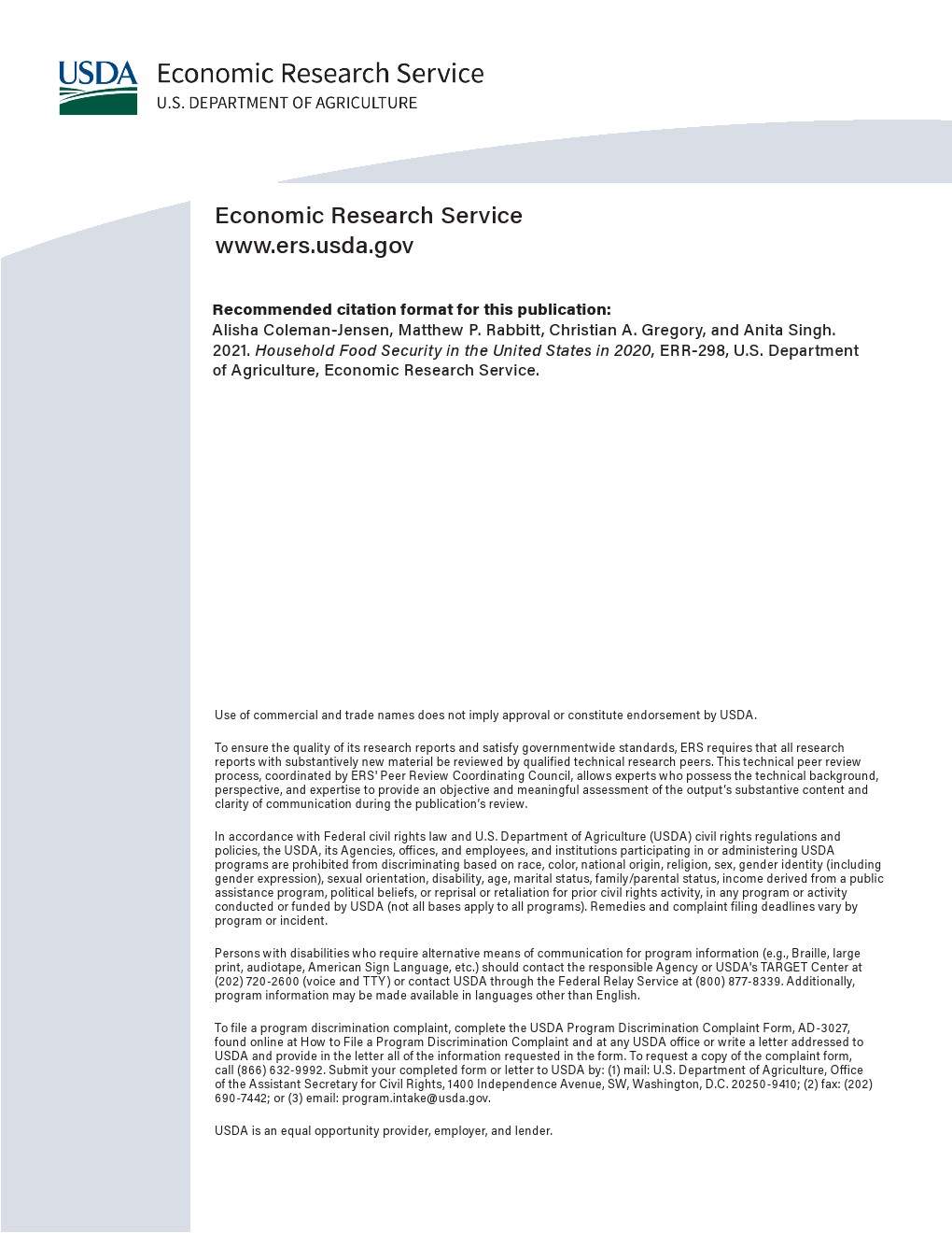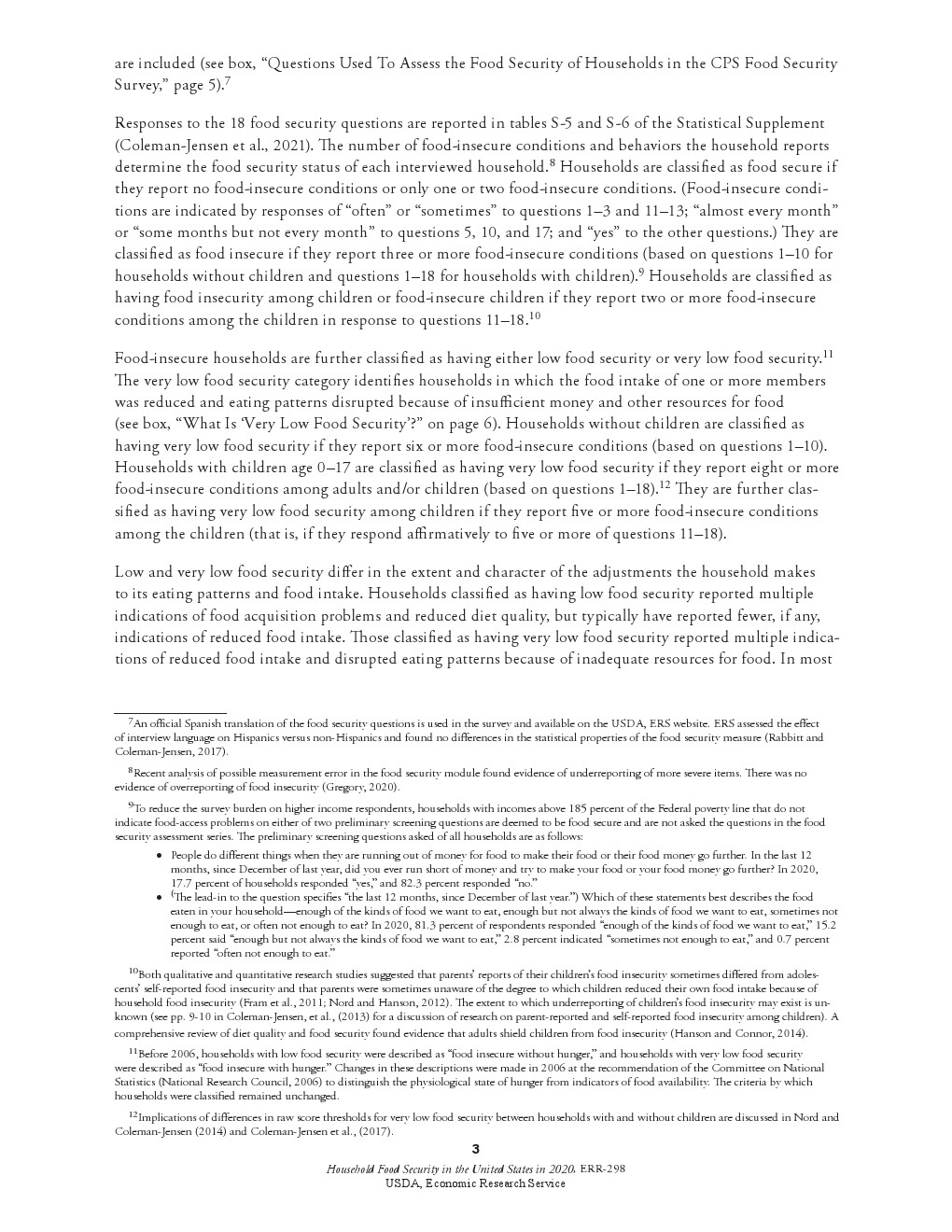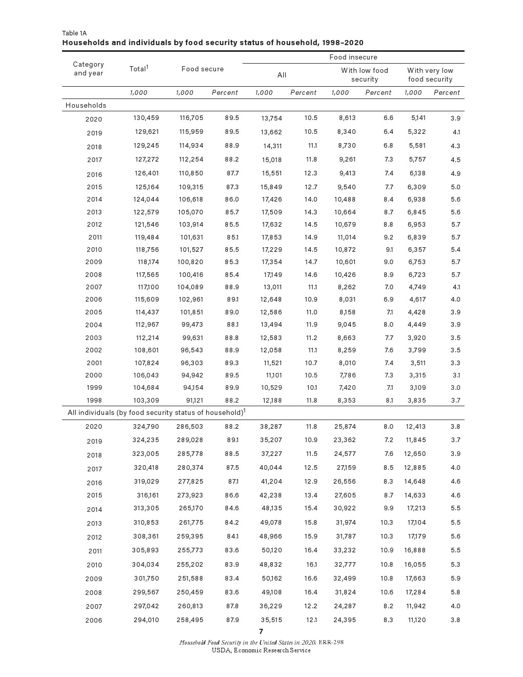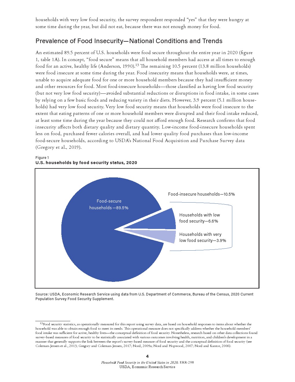 2020年,89.5%的美国家庭能保证粮食安全。剩下的10.5%则面临着粮食不充足的威胁(1380万户家庭)。2020年粮食不充足的普遍程度与2019年(10.5%)持平。 2020年,3.9%的美国家庭(510万户)面临较低的粮食安全水平。2019年的数字为4.1%。在更为严重的粮食不充足状况下,一些家庭成员的食物摄入量减少,正常饮食模式有时会被打乱。