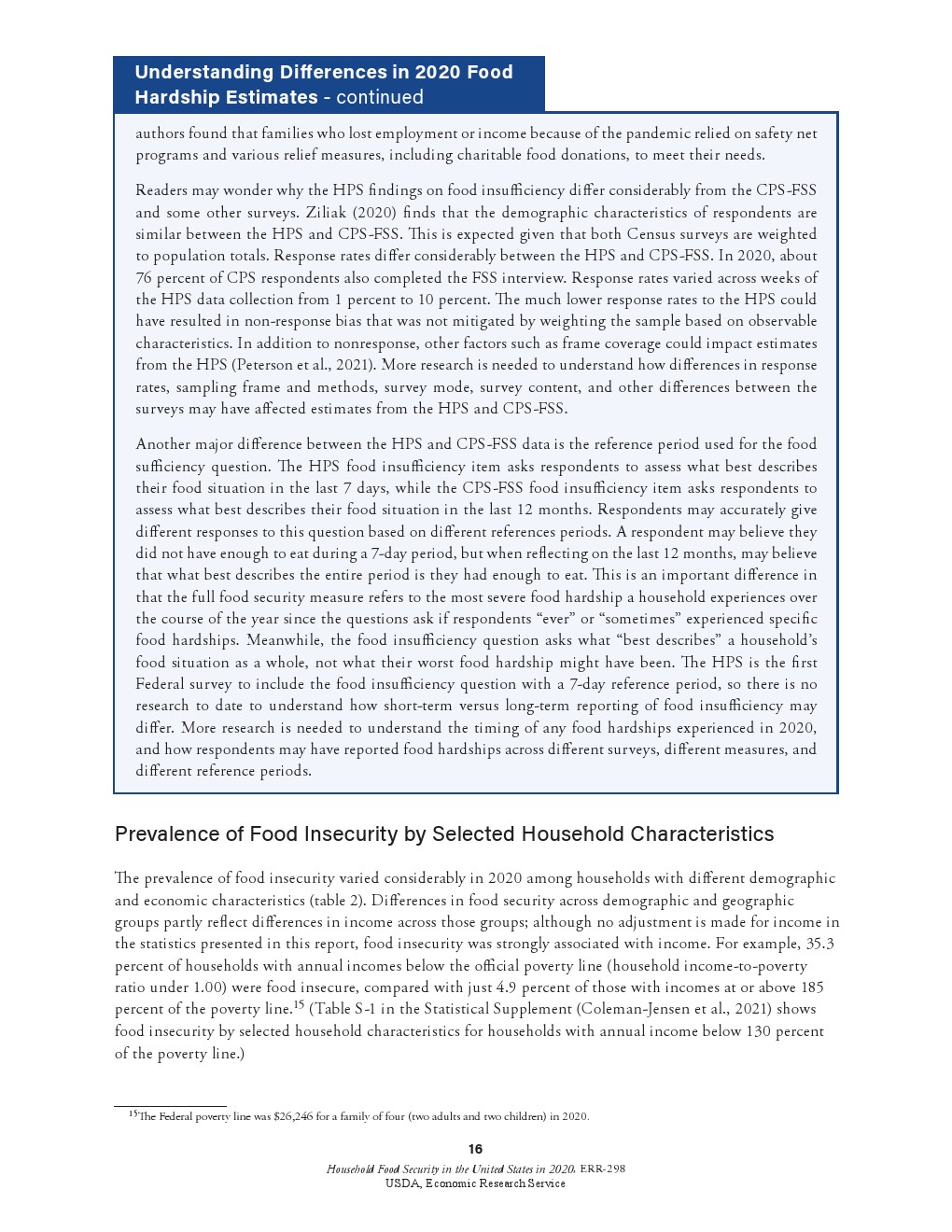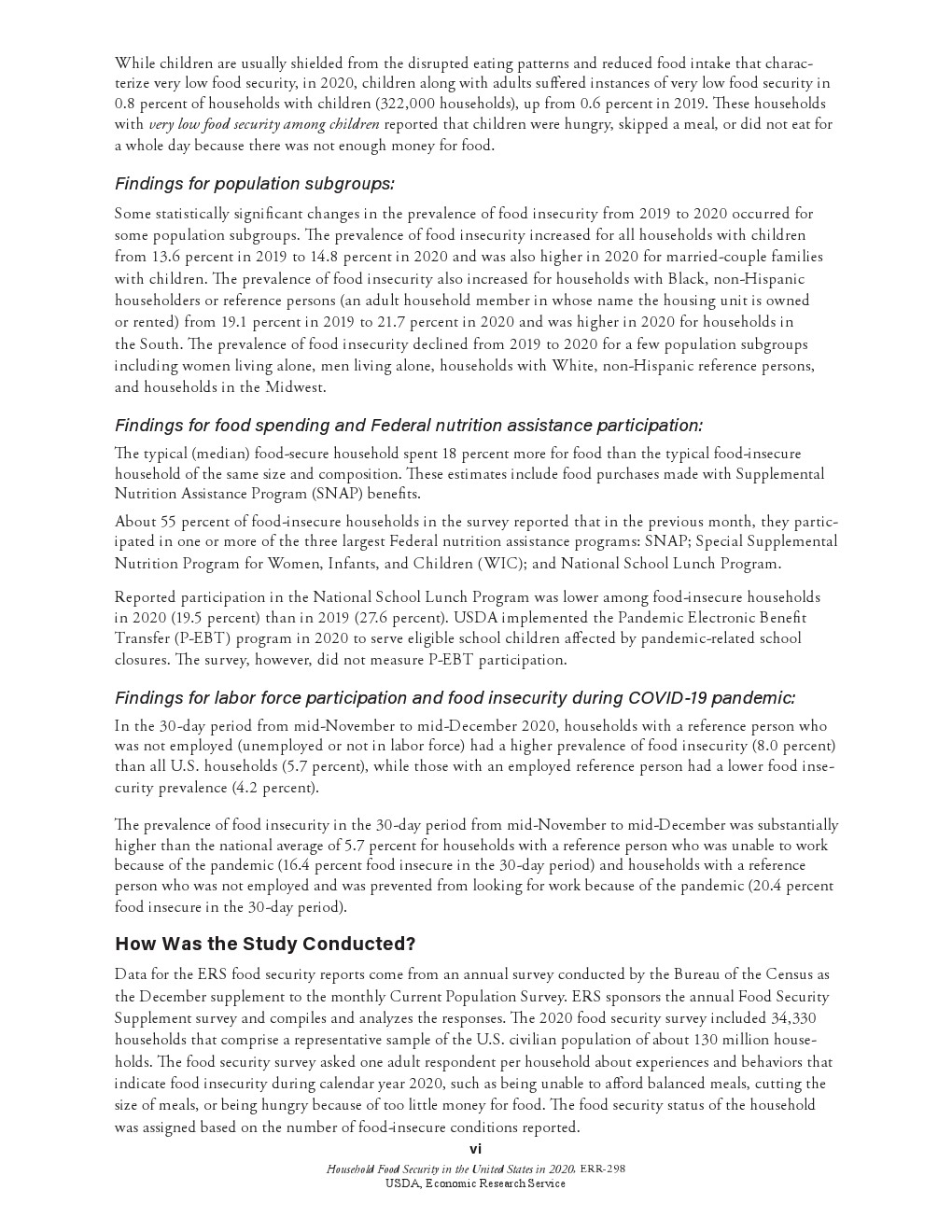 食品支出和联邦营养援助参与调查结果:典型食品安全的家庭的食品支出比同等规模和构成的家庭高18%。这些估计包括使用补充营养援助计划(SNAP)福利购买的食品。约55%的食品不安全的家庭报告说,上个月他们参加了三大联邦营养援助计划中的一个或多个,包括SNAP,妇女、婴儿和儿童特别补充营养计划(WIC)和全国学校午餐计划。
