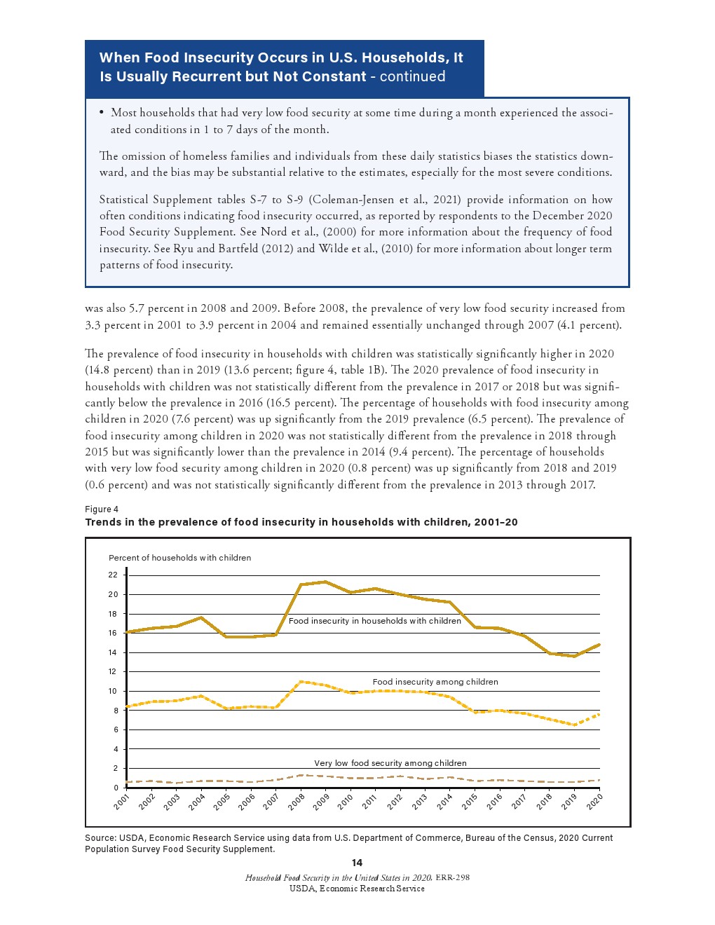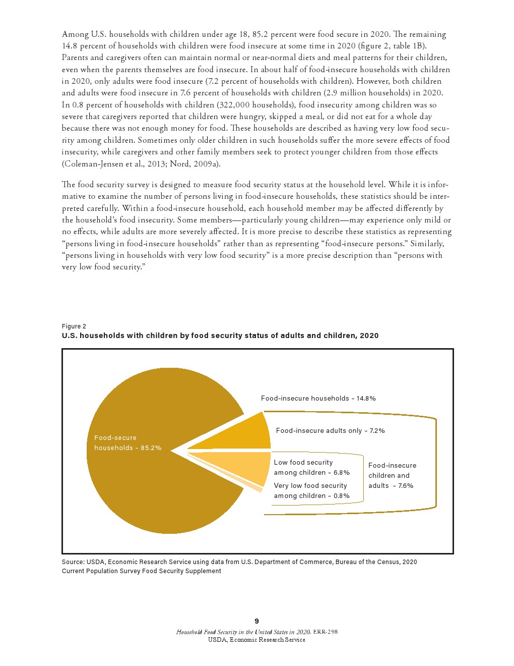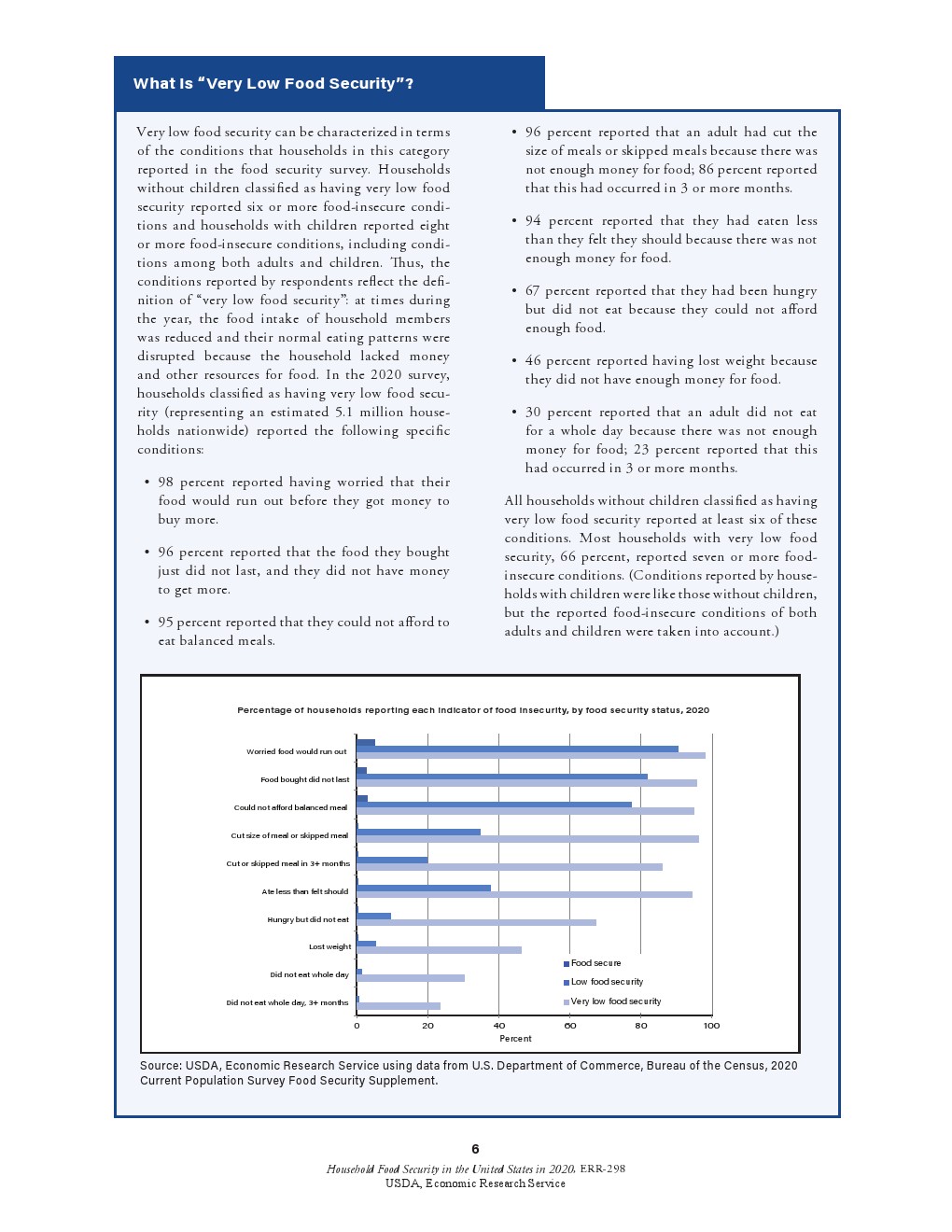 虽然儿童通常不会受到食物安全性极低的威胁和食物摄入减少的影响,但在2020年0.8%的儿童面临食物安全性极低的问题(322000个家庭),2019年这一比例为0.6%。这些家庭报告说,由于没有足够的钱购买食品,儿童挨饿、不吃饭或一整天都没有食物。