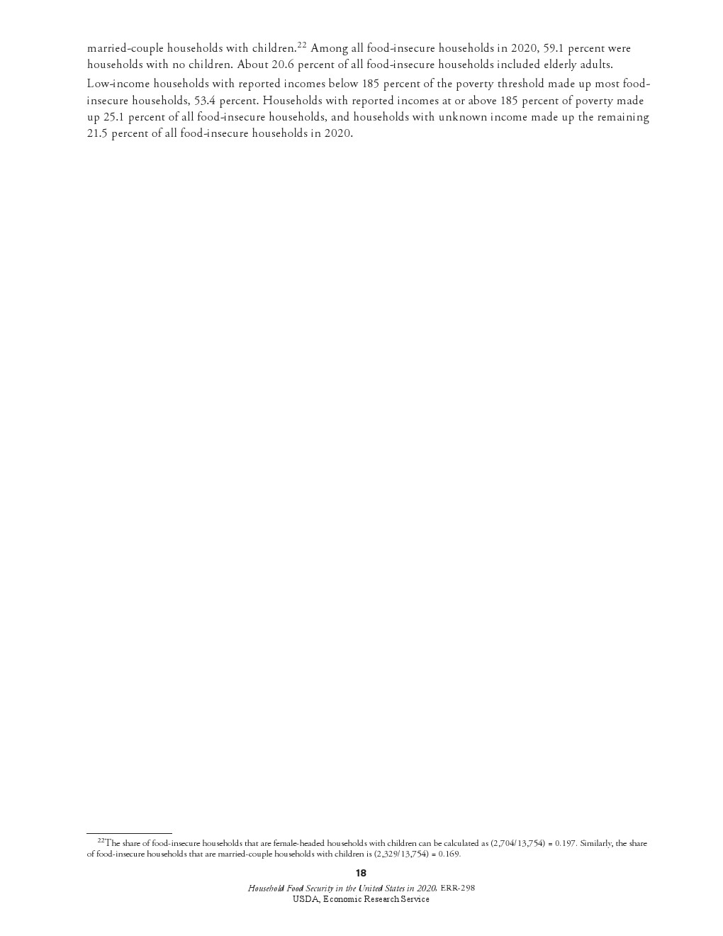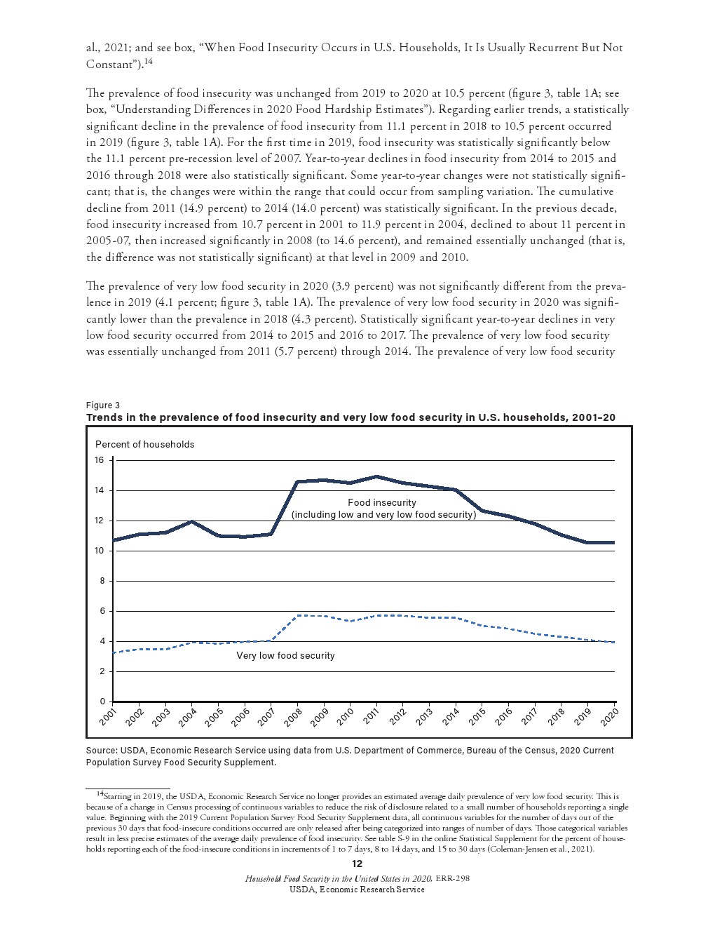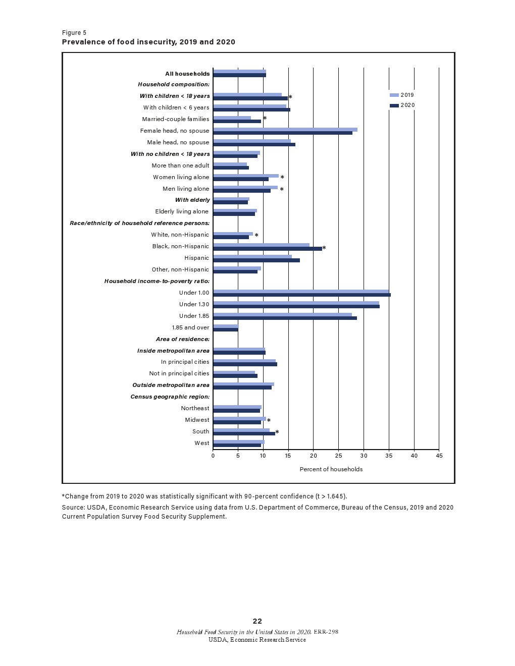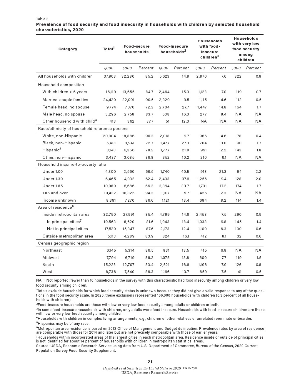 少数民族的调查结果:非裔、非西班牙裔家庭的粮食不充足率从2019年的19.1%上升到2020年的21.7%。2020年南方家庭的粮食不安全性更高。从2019年到2020年,少数民族的粮食不安全性有所下降。