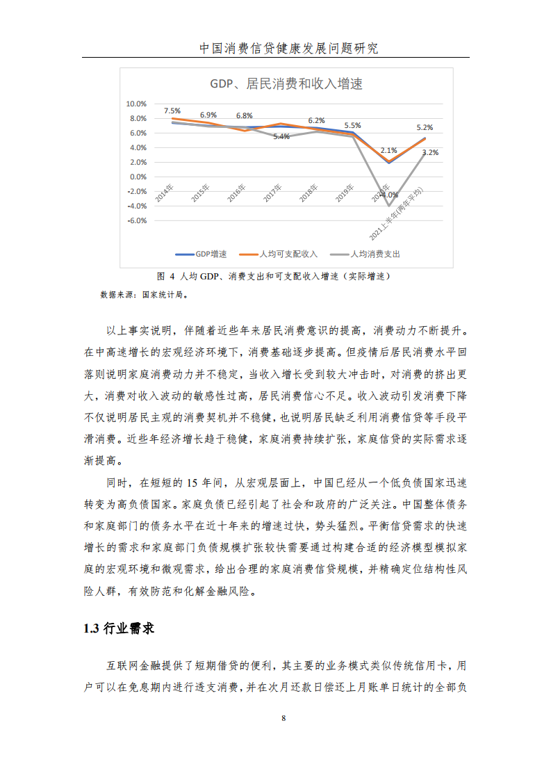 报告对有息部分的合理消费信贷收入比也进行了深入研究,并进一步使用了中国家庭金融调查(CHFS)2019年的数据探讨了中国家庭实际的信贷状况,发现整体上看当前我国家庭实际的消费信贷收入比尚处于合理范围之内,但各群体之间的分化也可能会导致家庭部门潜在的结构性风险。具有较强偿债能力的收入增长较快的群体,通常并没有充分借贷;很多承担了较高负债甚至超额负债的家庭则是长期偿债能力较弱的家庭。因此,虽然中国家庭部门的信贷健康状况尚且良好,但结构的不良因素仍具有引发金融违约风险的可能性,需要优化引导。家庭需要理性决策家庭信贷行为,不倡导家庭选择较高负债规模。