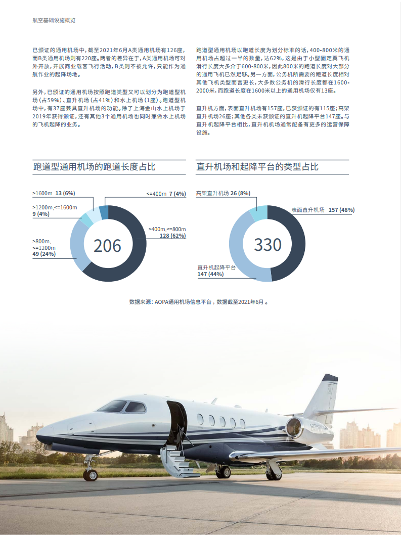 截至2021年6月中国内地运营中的通用航空器总量达3,066架,相比2020年底增长4%,中国实际在运行的通航企业为454家,相比2020年底减少了2 家。尽管运营中的通用航空器依旧持续增长,但实际在运行的通航企业数量是自2014年以来的第一次减少。