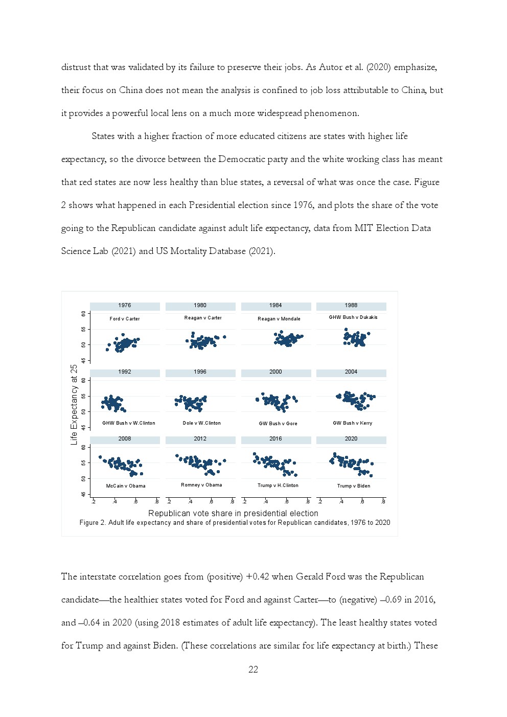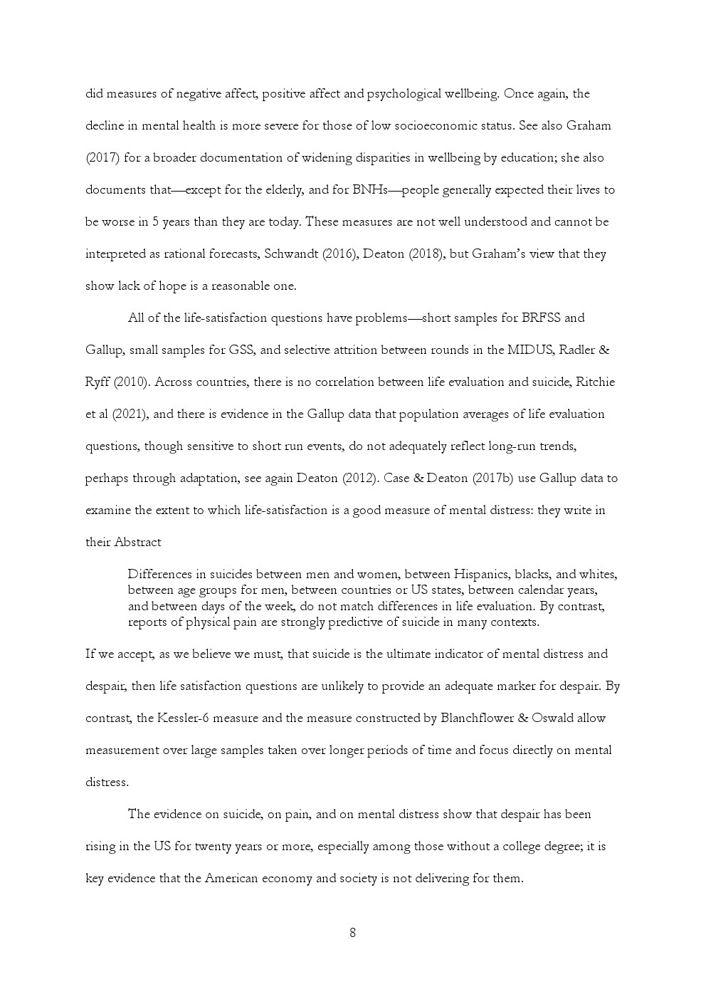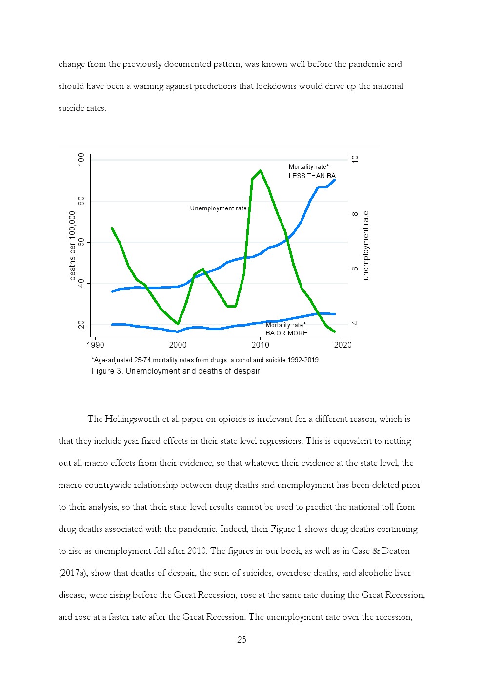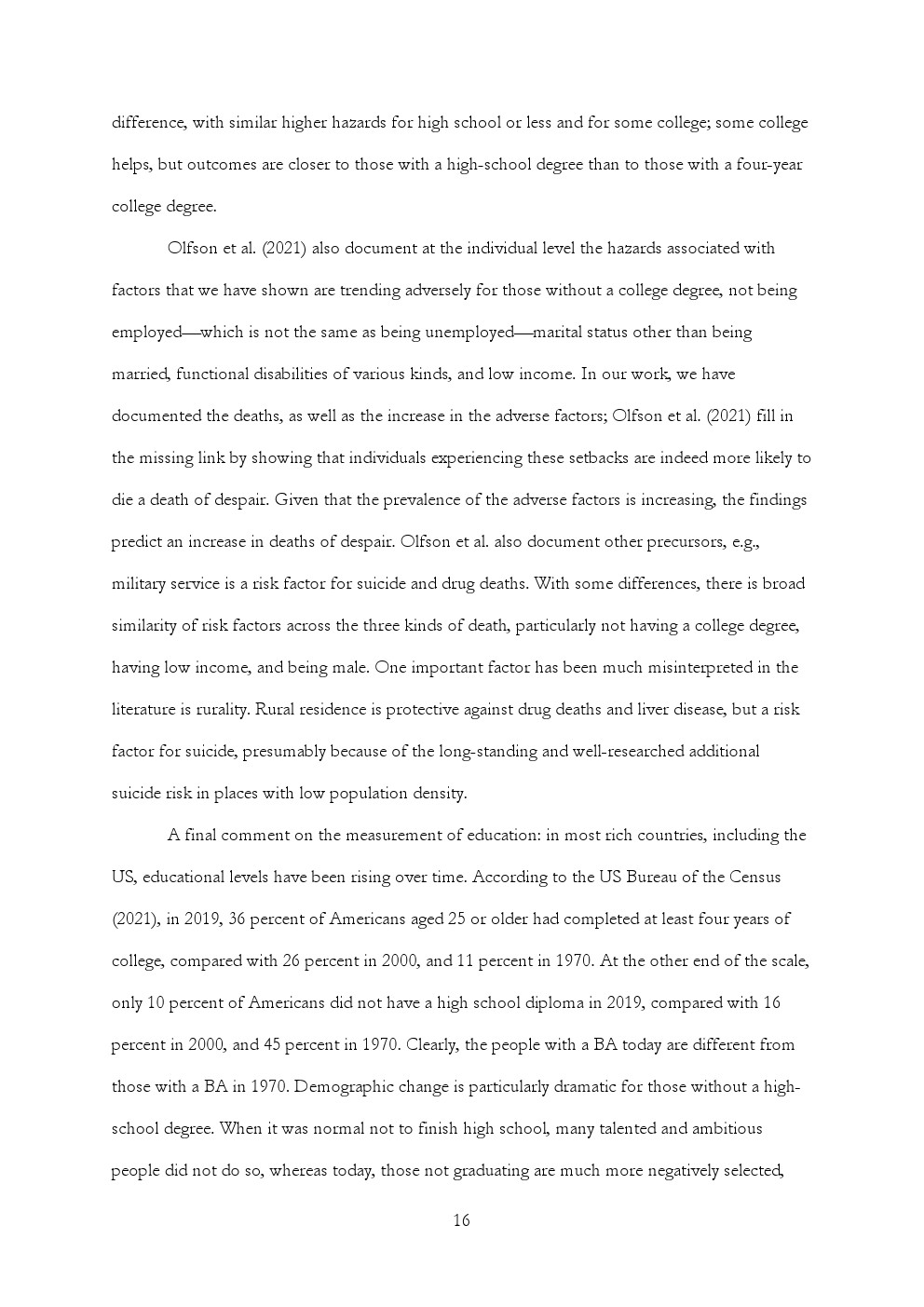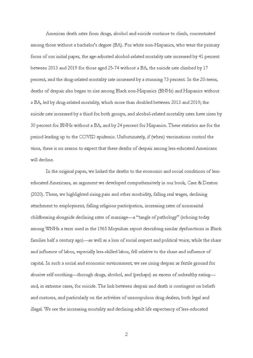 美国吸毒、酗酒和自杀的死亡率继续攀升,主要集中在那些没有学士学位的人口中。2013年至2019年间,25-74岁没有学士学位的非西班牙裔白人中与酒精相关的死亡率增长了41%,自杀死亡率增长17%,与药物相关的死亡率增长73%。在20岁左右的美国黑人中,没有学士学位的人的自杀死亡率也开始上升,与毒品相关的死亡率增加了一倍,与酒精相关的死亡率增加了30%。