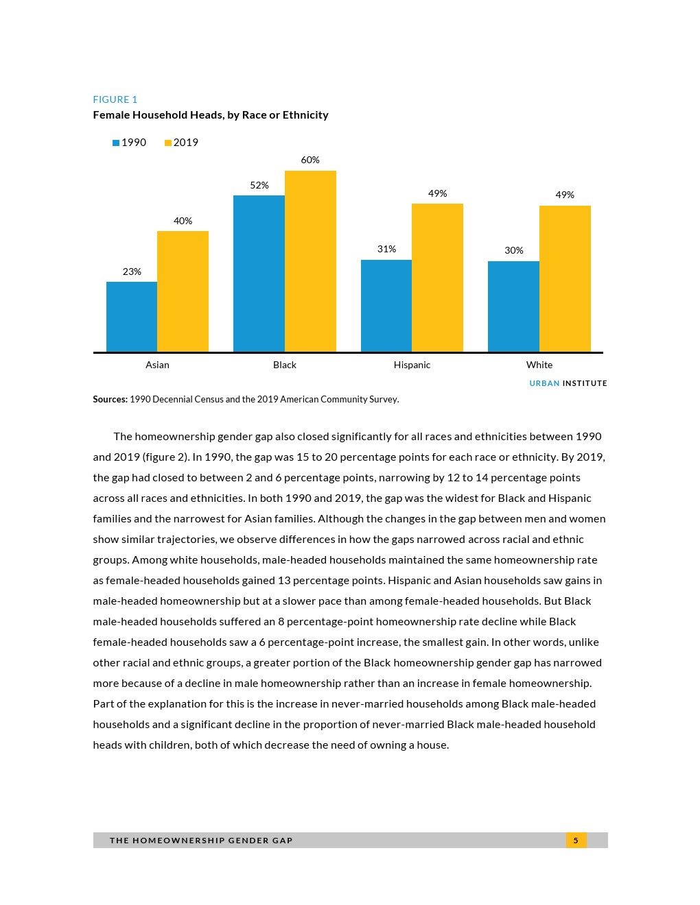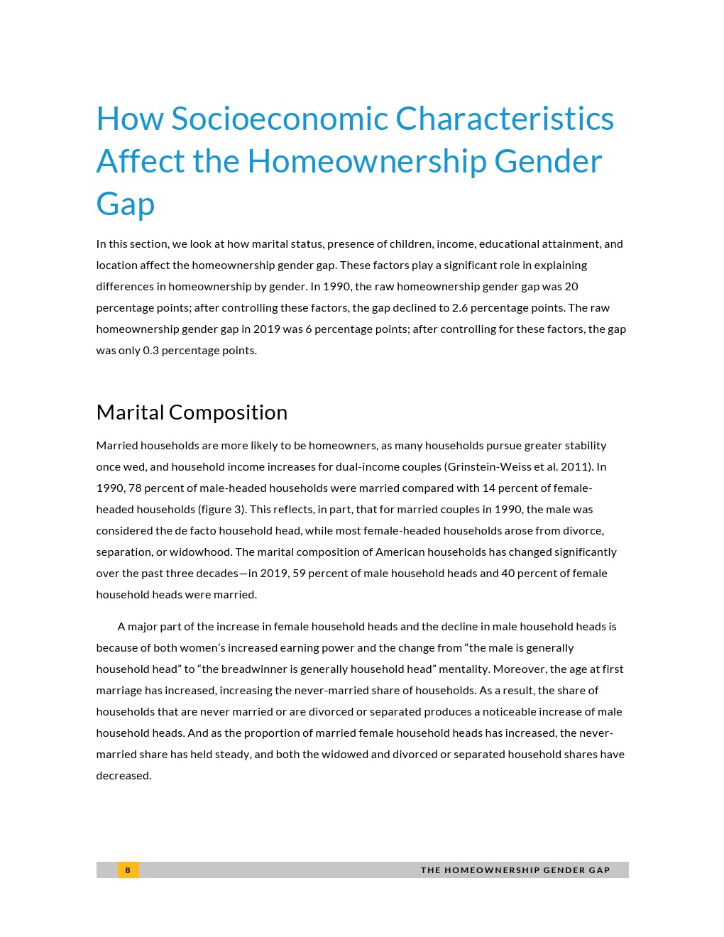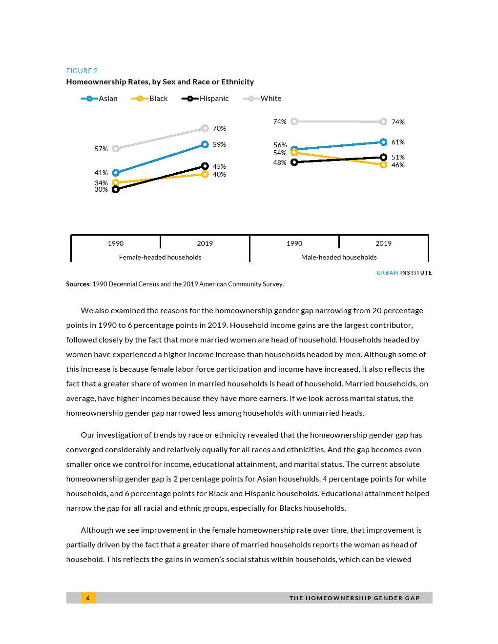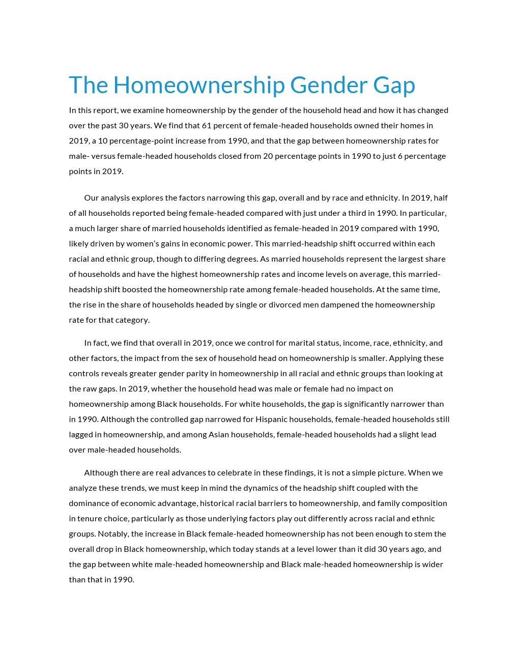 这份报告通过户主的性别调查了房屋所有权情况,以及在过去三十年它是如何变化的。分析探讨了缩小住房所有权性别差距的因素,包括总体以及种族和民族。这种缩小主要归因于家庭收入的增加,其次是更多的已婚妇女成为户主。