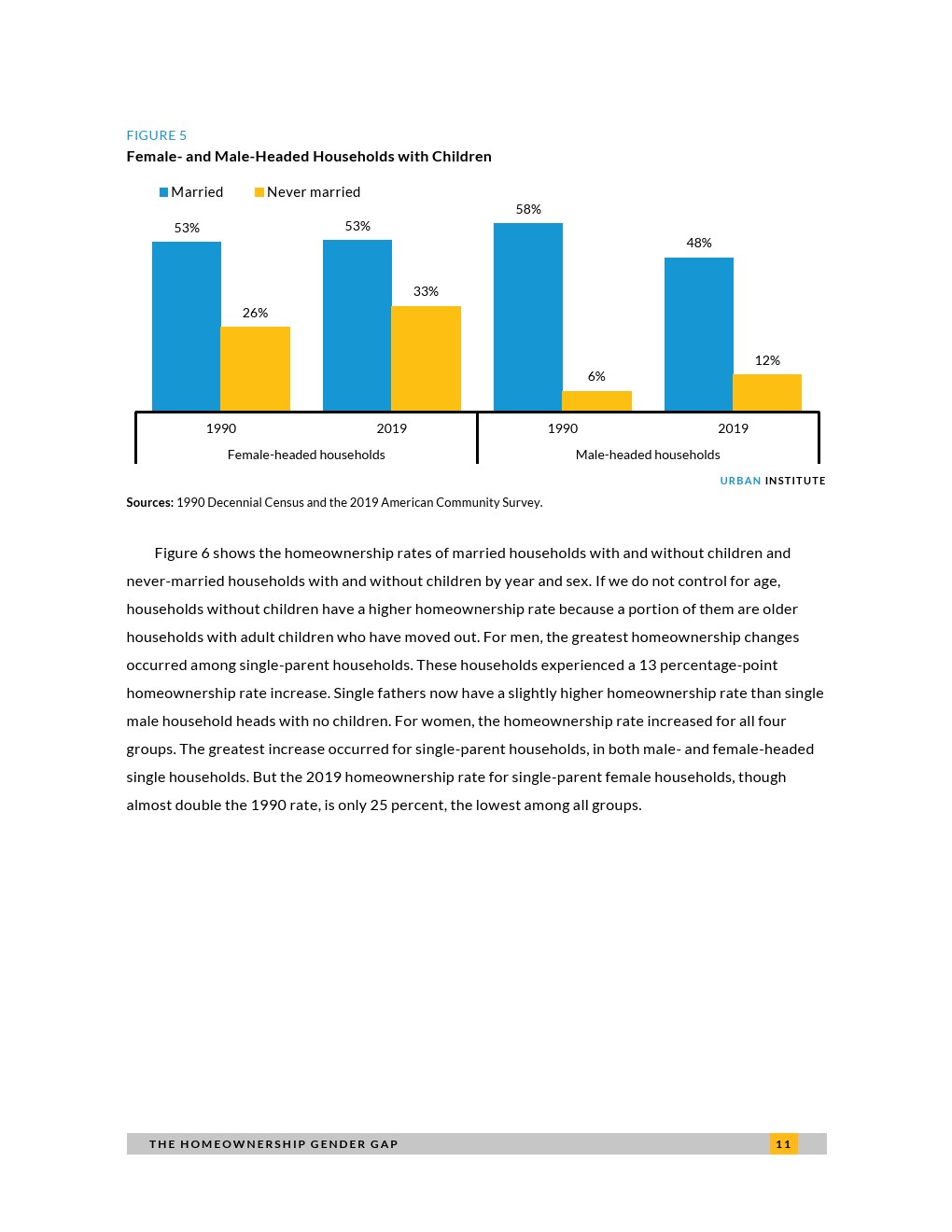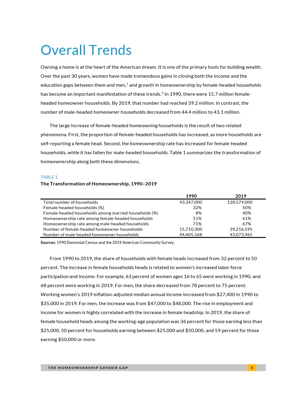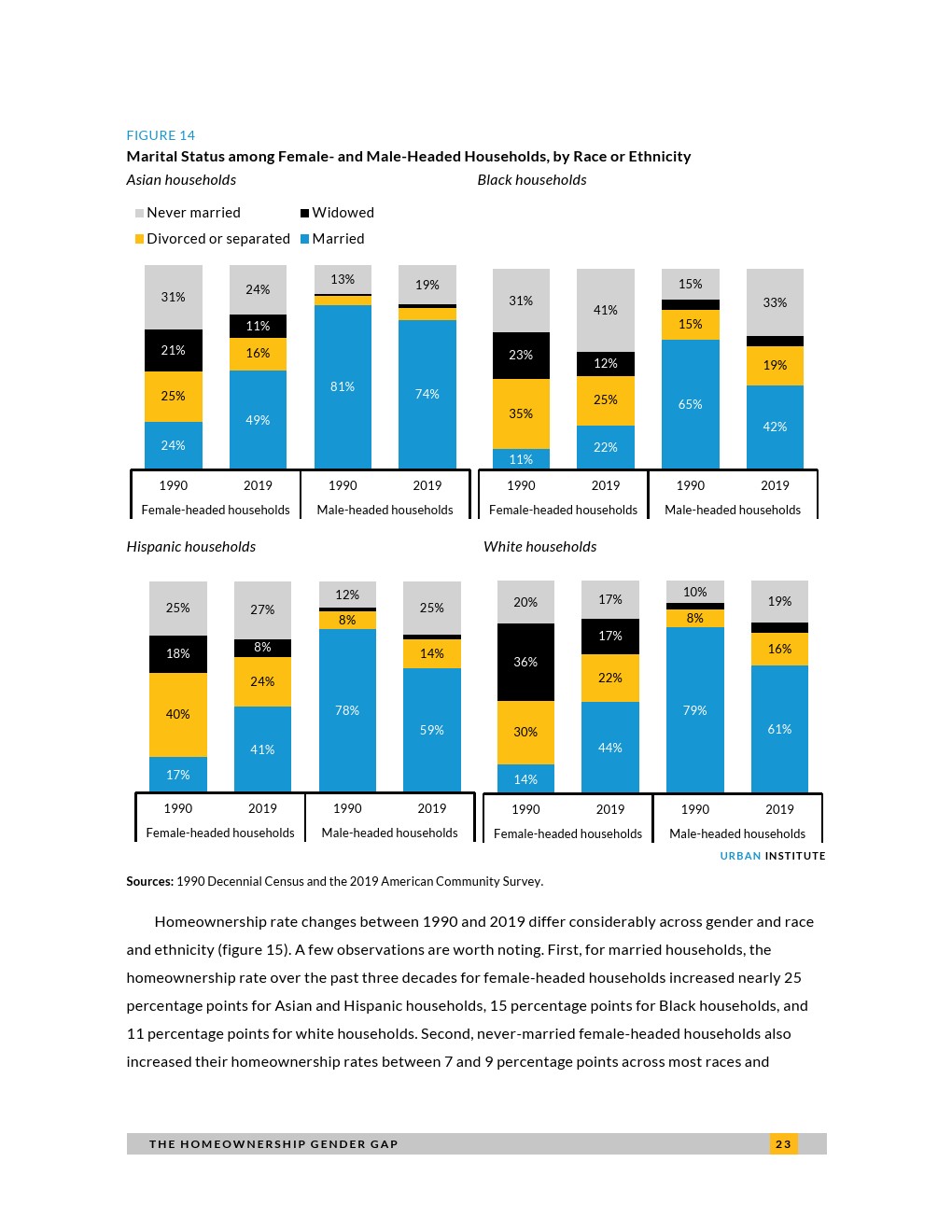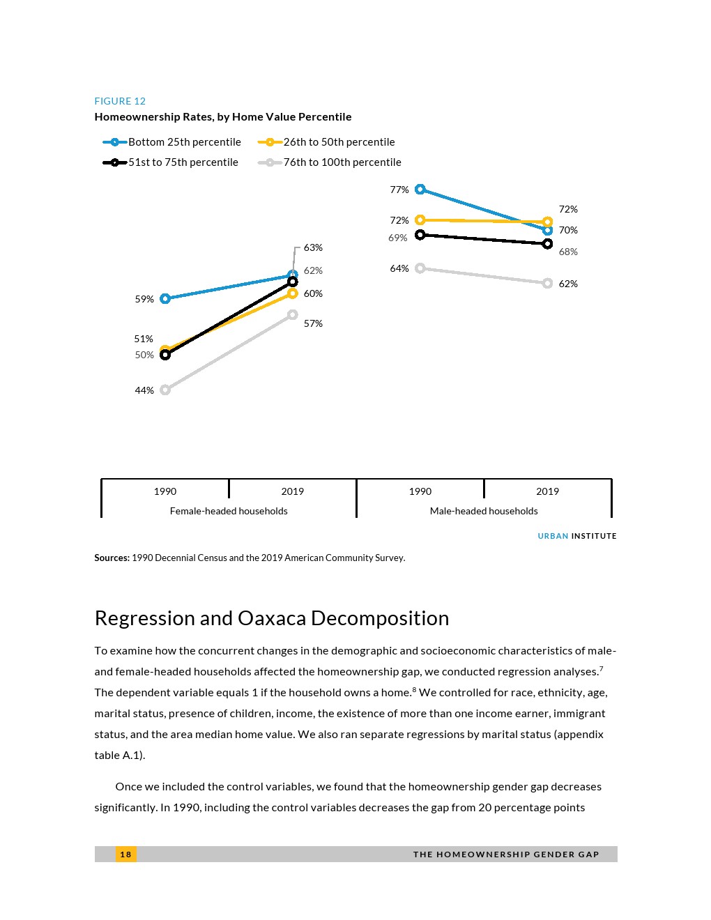 这份报告通过户主的性别调查了房屋所有权情况,以及在过去三十年它是如何变化的。分析探讨了缩小住房所有权性别差距的因素,包括总体以及种族和民族。这种缩小主要归因于家庭收入的增加,其次是更多的已婚妇女成为户主。